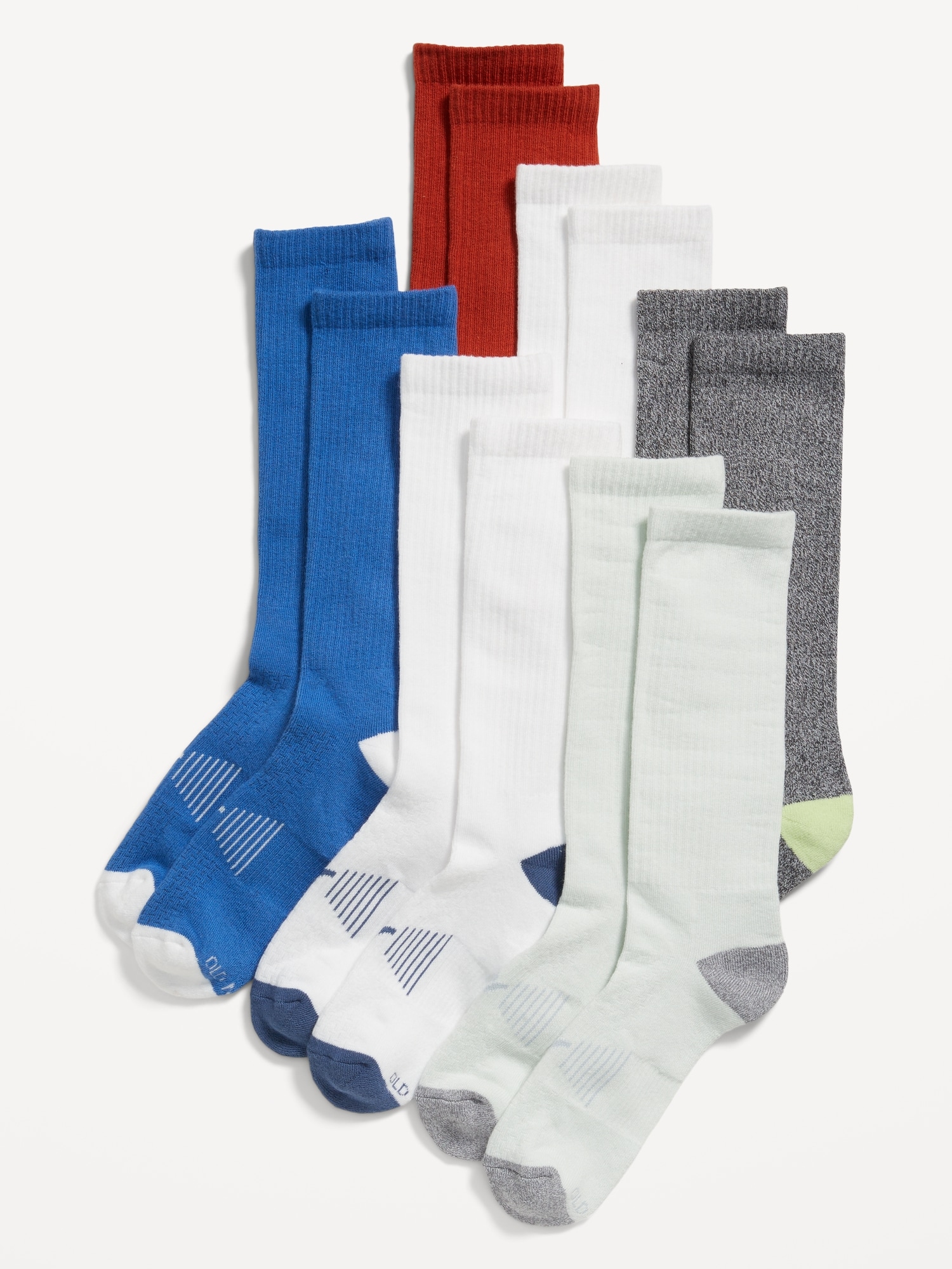 6-Pack Athletic Tube Socks for Men: pack includes 6 pairs of solid performance socks, notched toe seams for comfort, arch support, zoned cushioning, go-dry wicks moisture, #684851