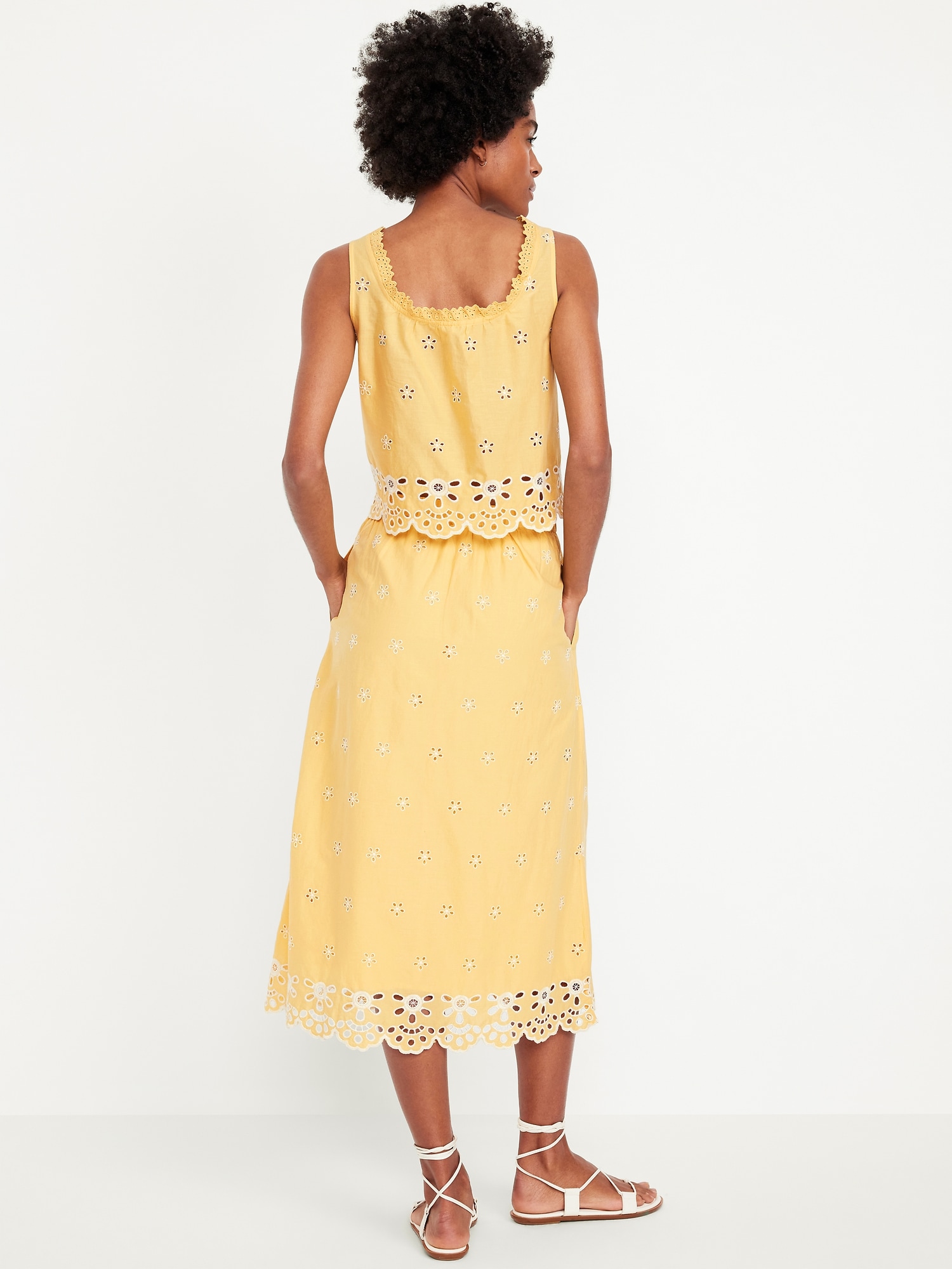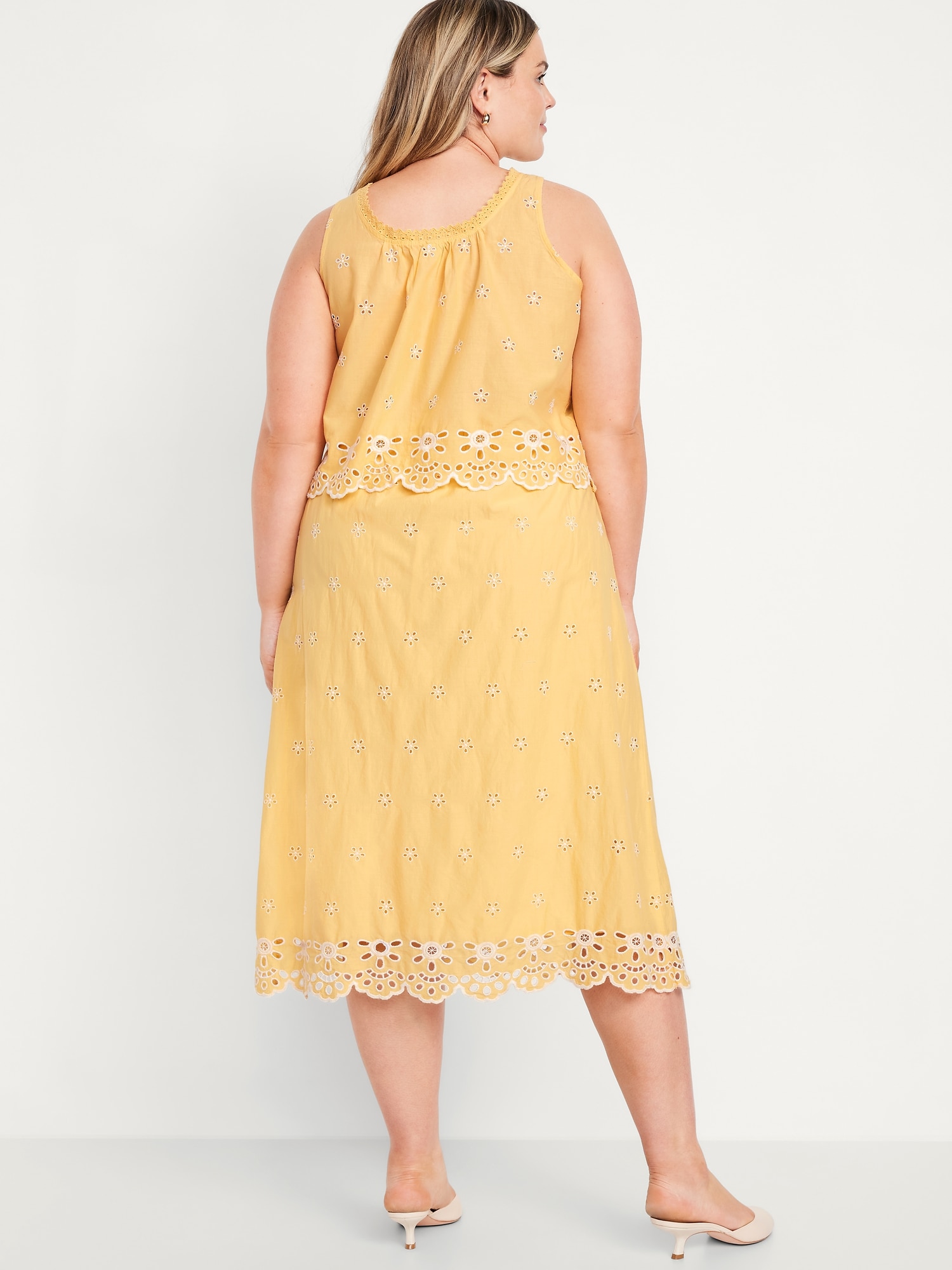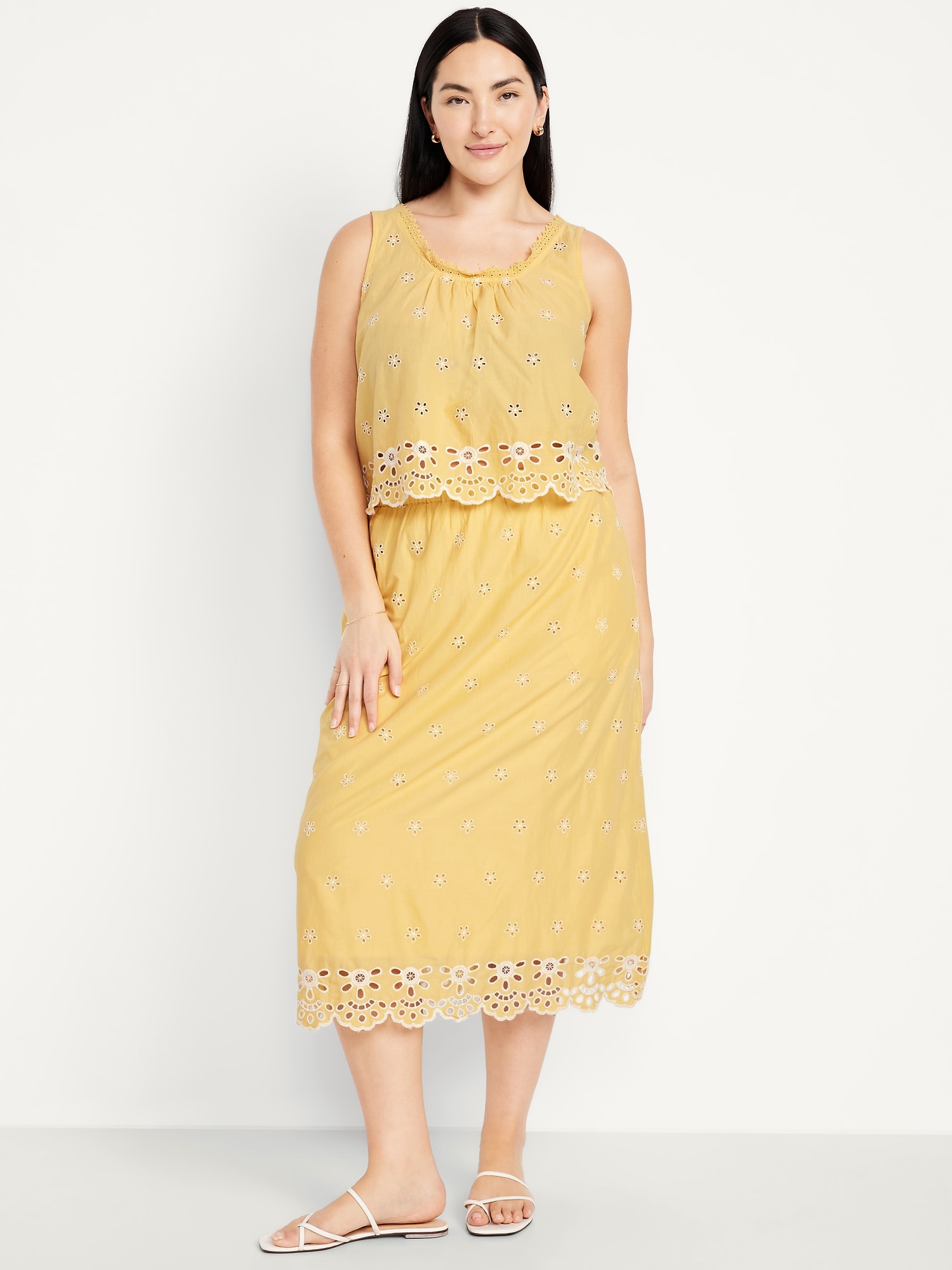 A-Line Eyelet Midi Skirt: elastic pull-on waistband, all-over embroidered detail, eyelet-scallop hem, #705284