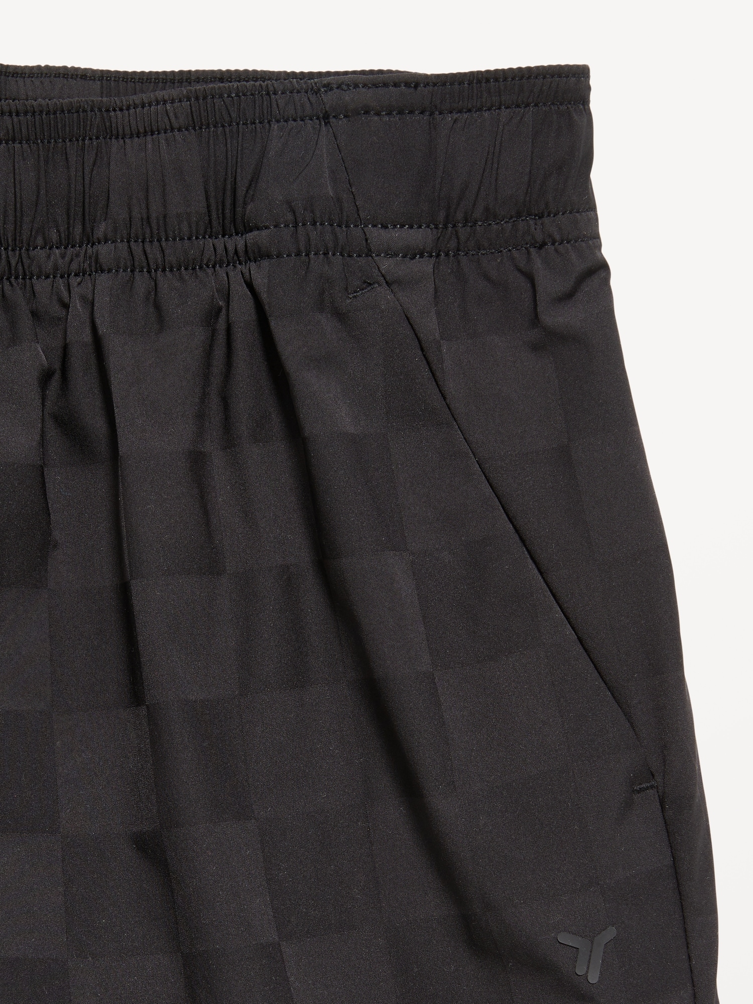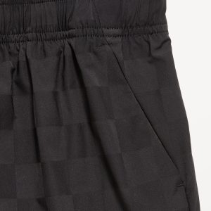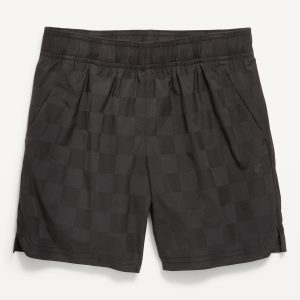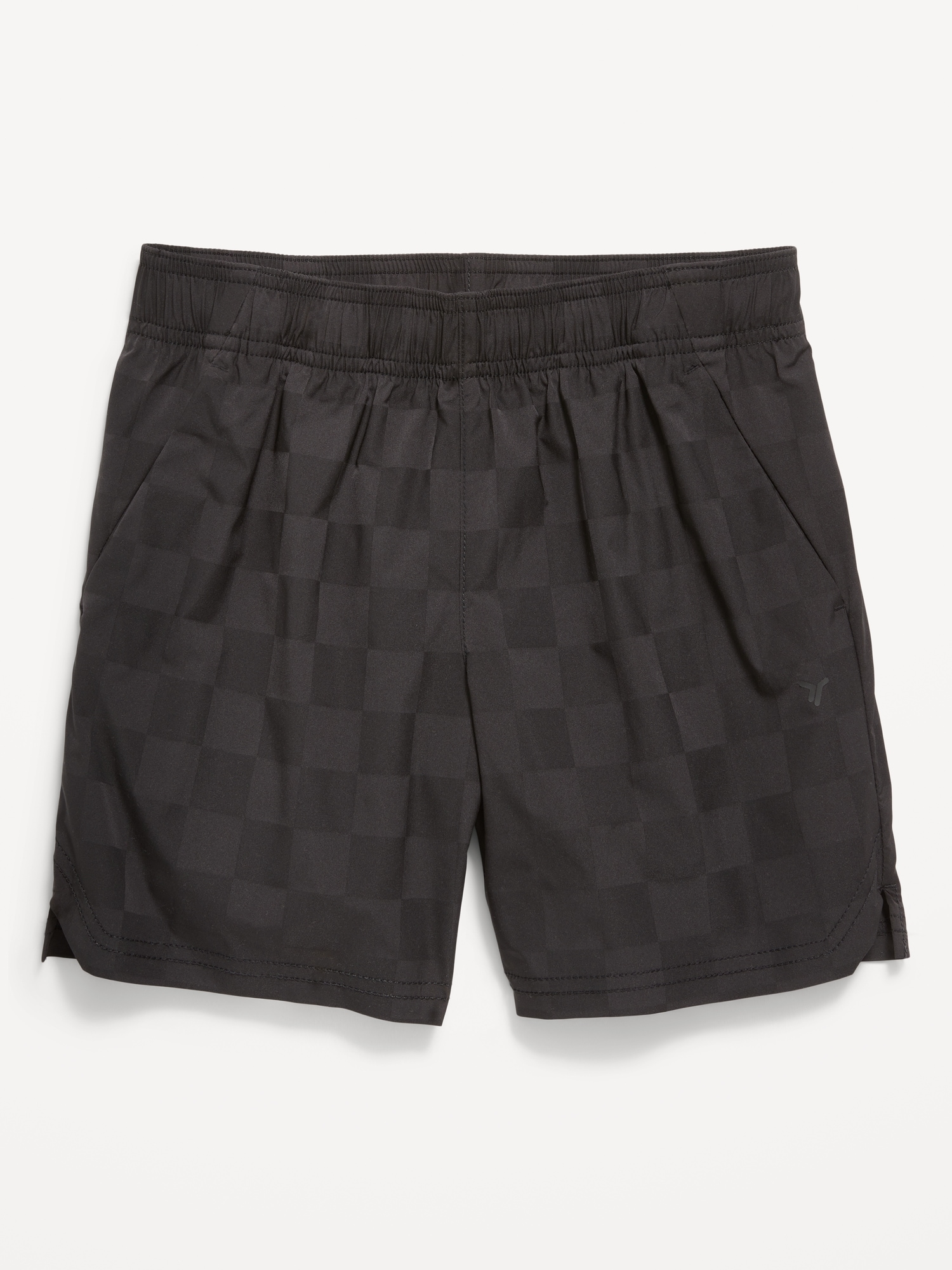 Above Knee Performance Shorts for Boys: elasticized waistband, functional drawstring, diagonal on-seam pockets, all-over checkered pattern, #762122