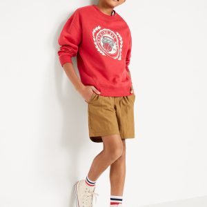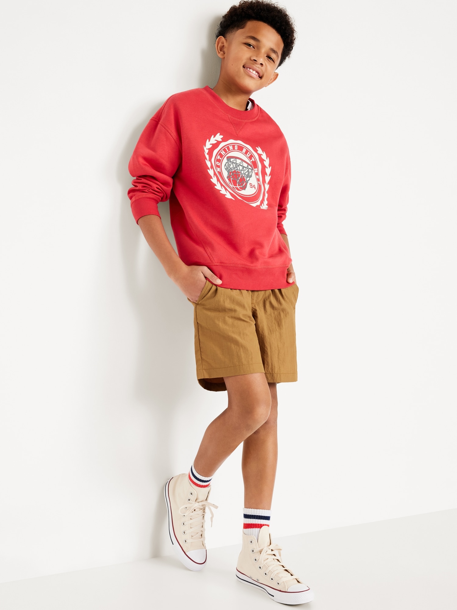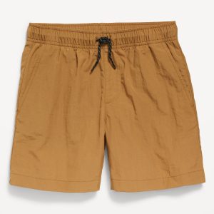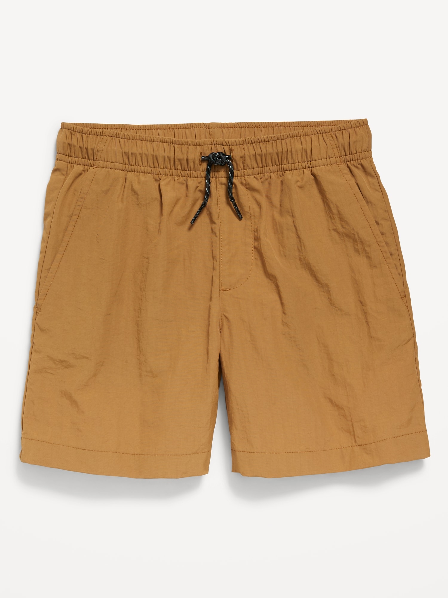 Above Knee Tech Shorts for Boys: elasticized waistband, functional drawstring, faux fly, diagonal on-seam pockets, single welt pocket at back, easy pull-on style, #860738
