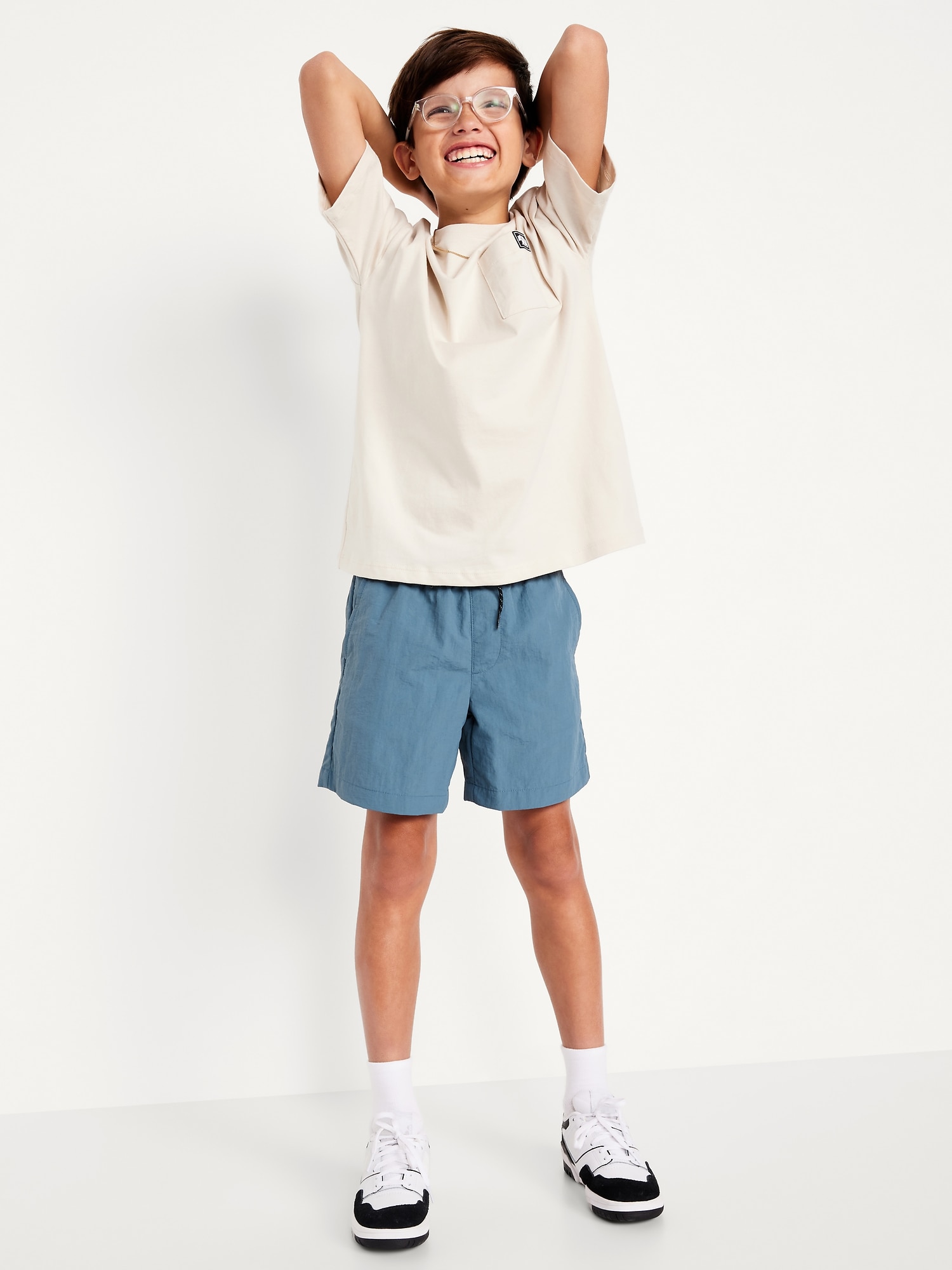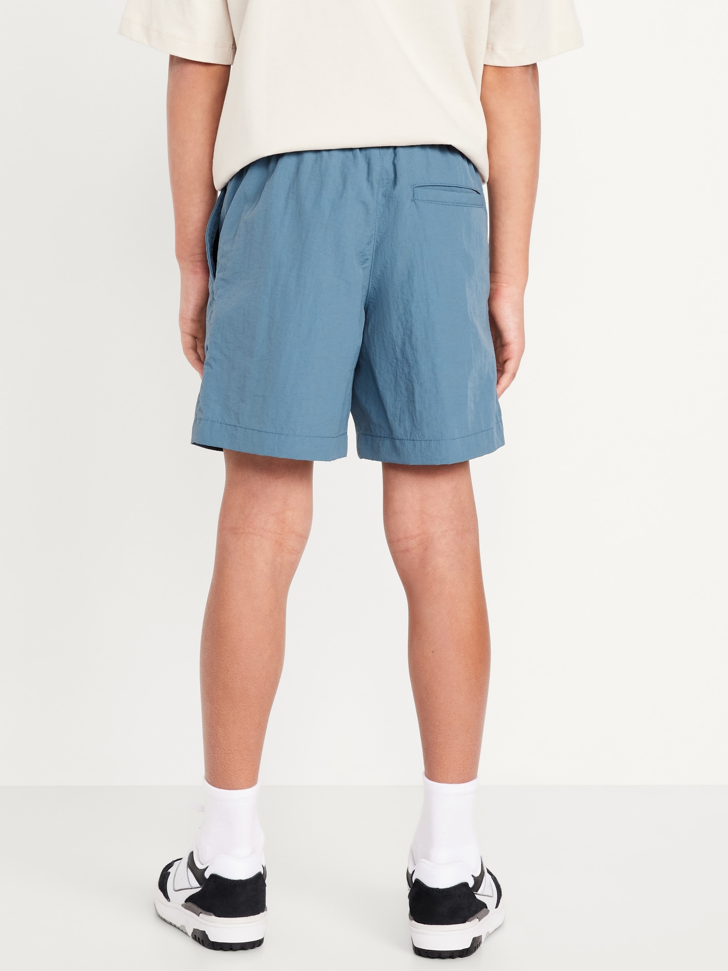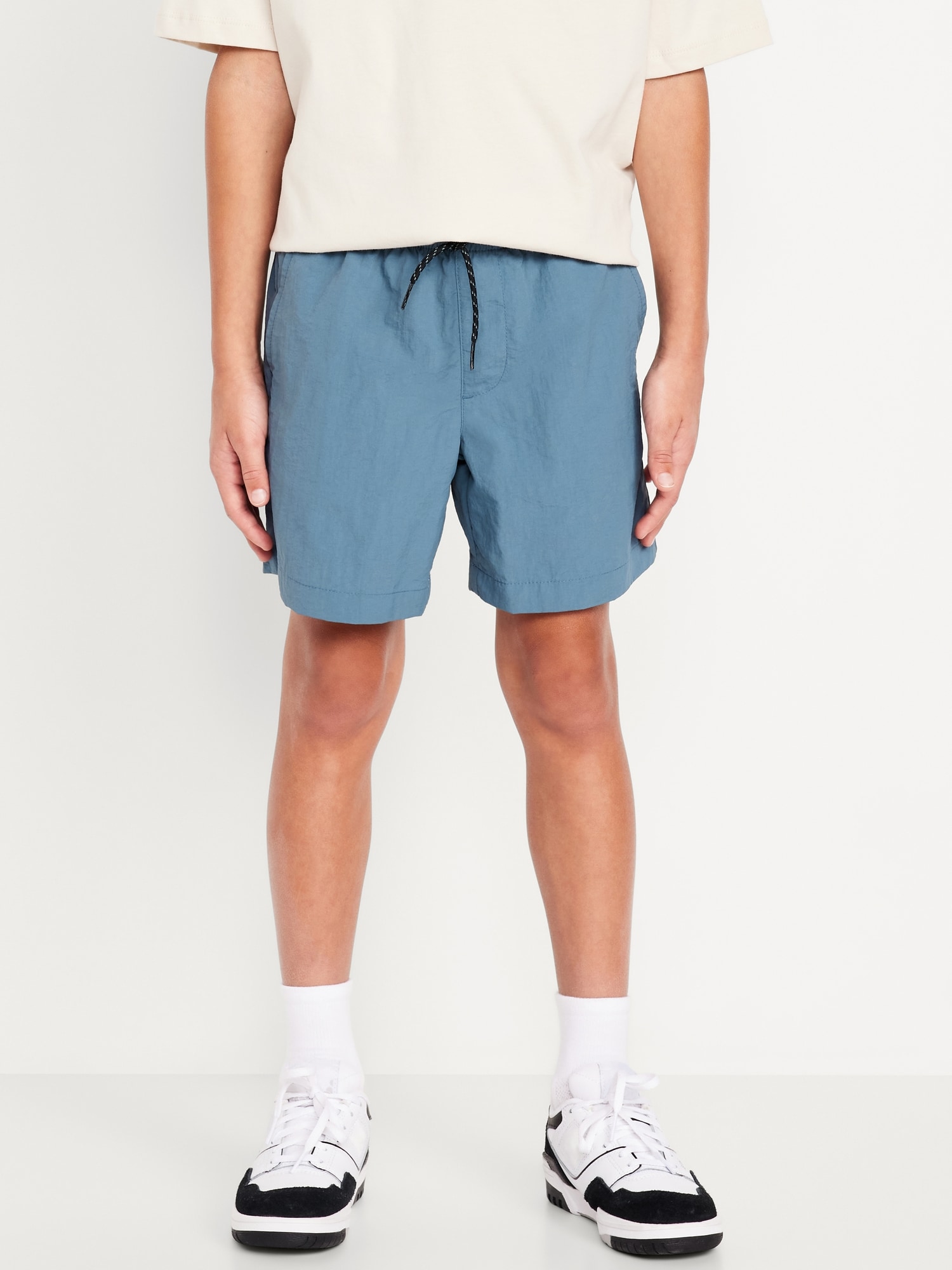 Above Knee Tech Shorts for Boys: elasticized waistband, functional drawstring, faux fly, diagonal on-seam pockets, single welt pocket at back, easy pull-on style, #860738