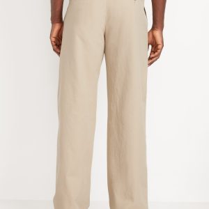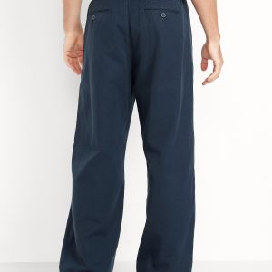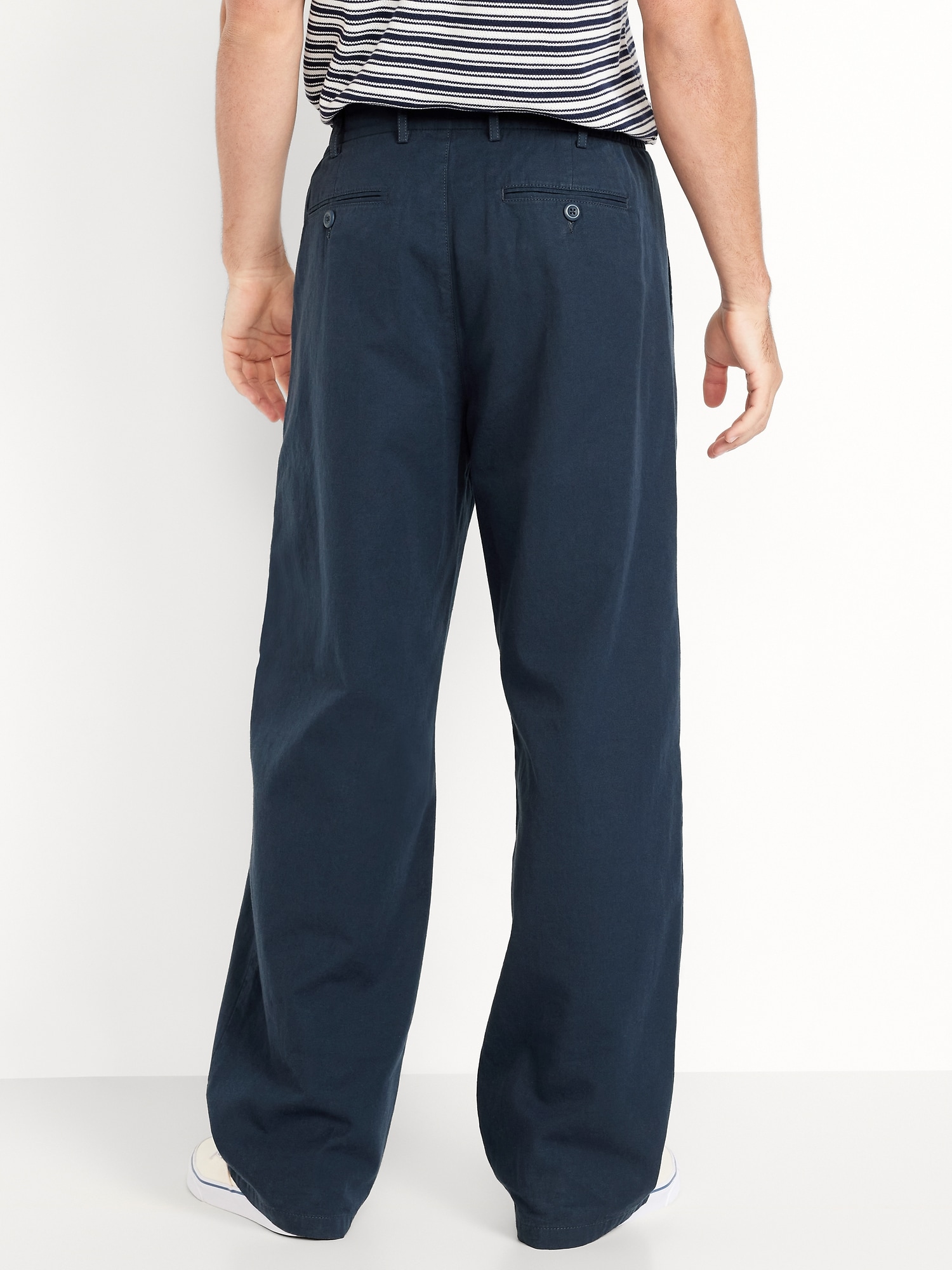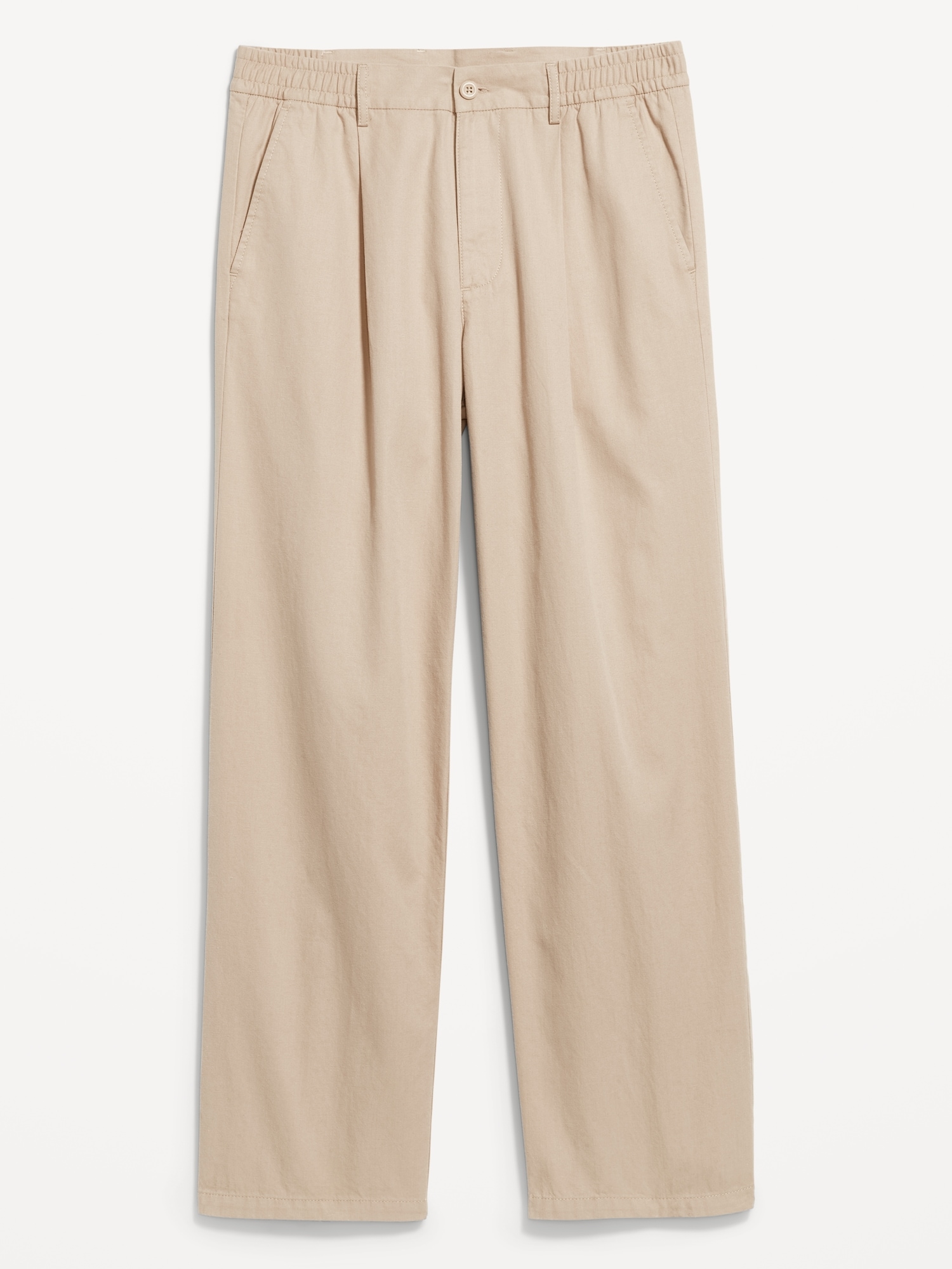 Baggy Pleated Chino Pants: Relaxed from hip to ankle with a laid-back attitude.button-front waistband with elastic sides, belt loops, zip fly, diagonal hip pockets, back button-welt pockets, pleated front, #751389