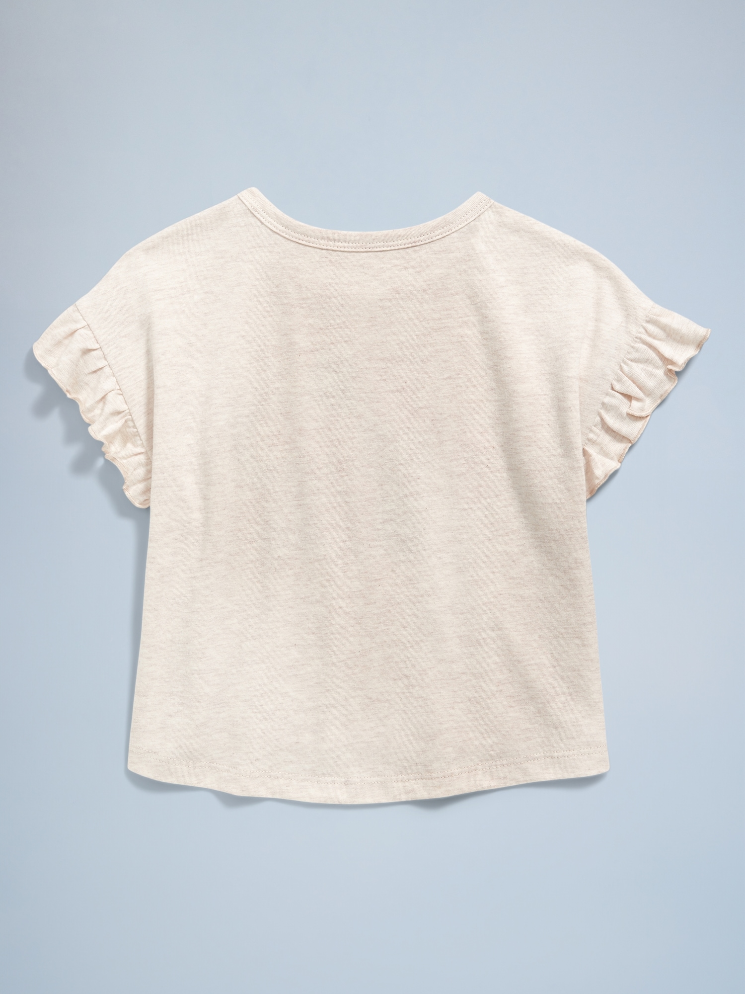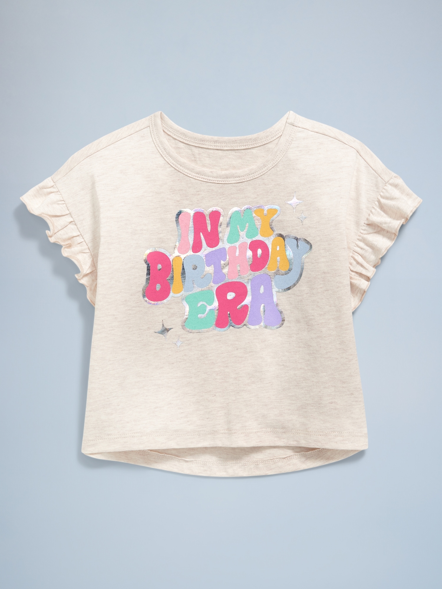 Birthday Graphic T-Shirt for Toddler Girls: The (Bestest) Birthday Shop!crew neck, short ruffle sleeves, graphic at front, rounded hem, #689939