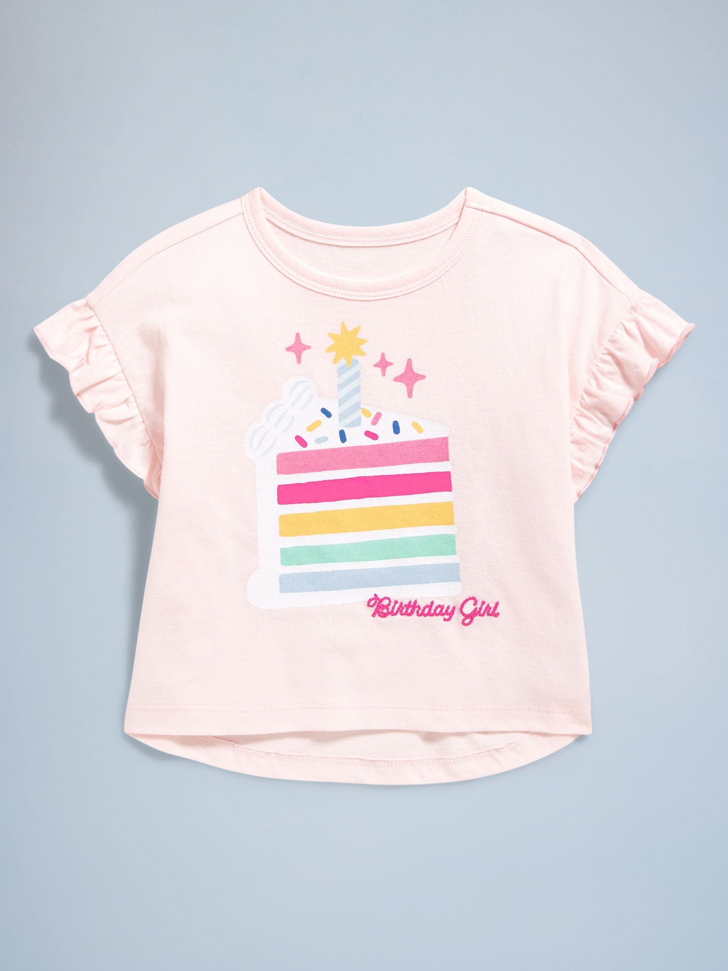 Birthday Graphic T-Shirt for Toddler Girls: The (Bestest) Birthday Shop!crew neck, short ruffle sleeves, graphic at front, rounded hem, #689939