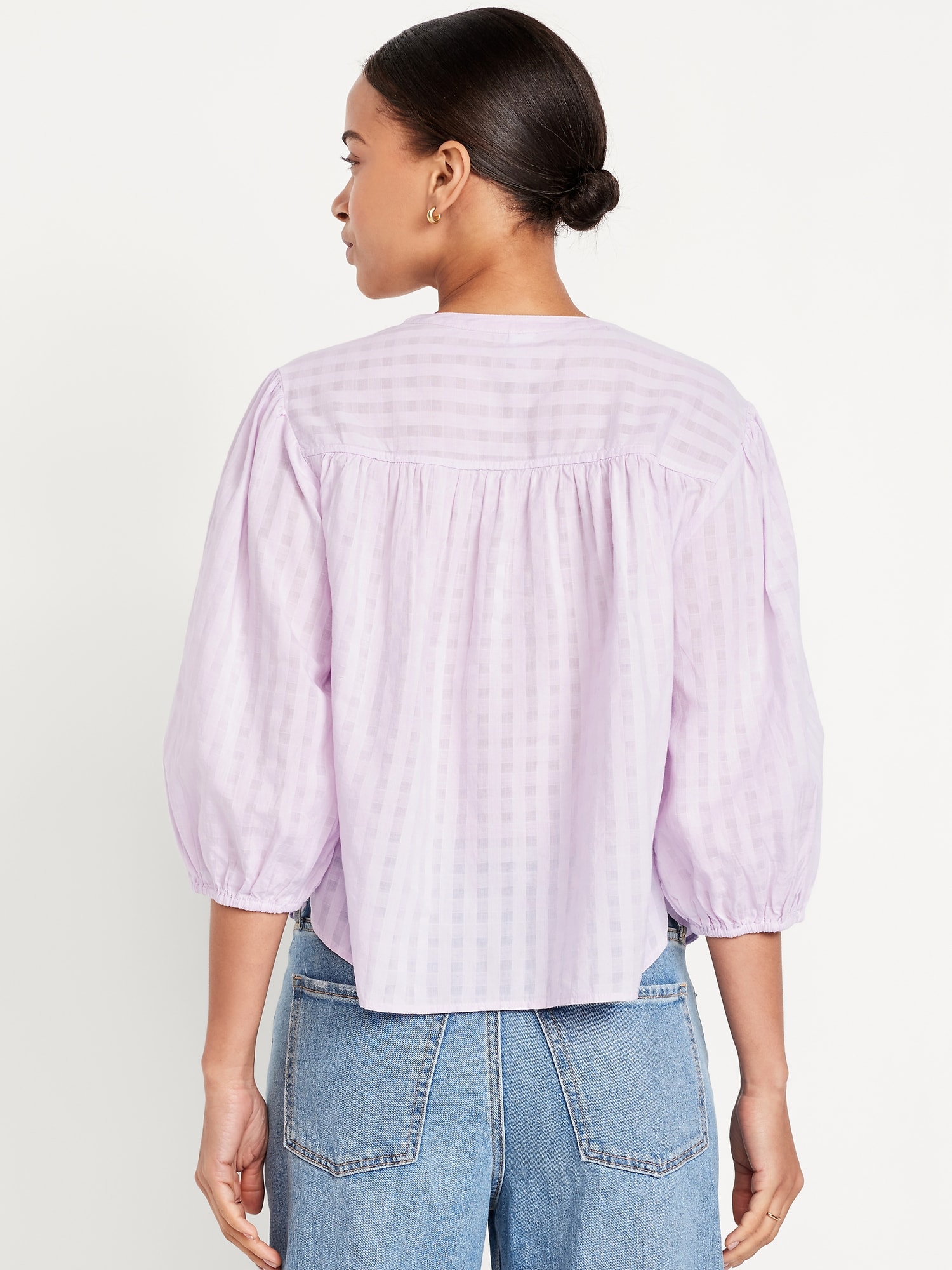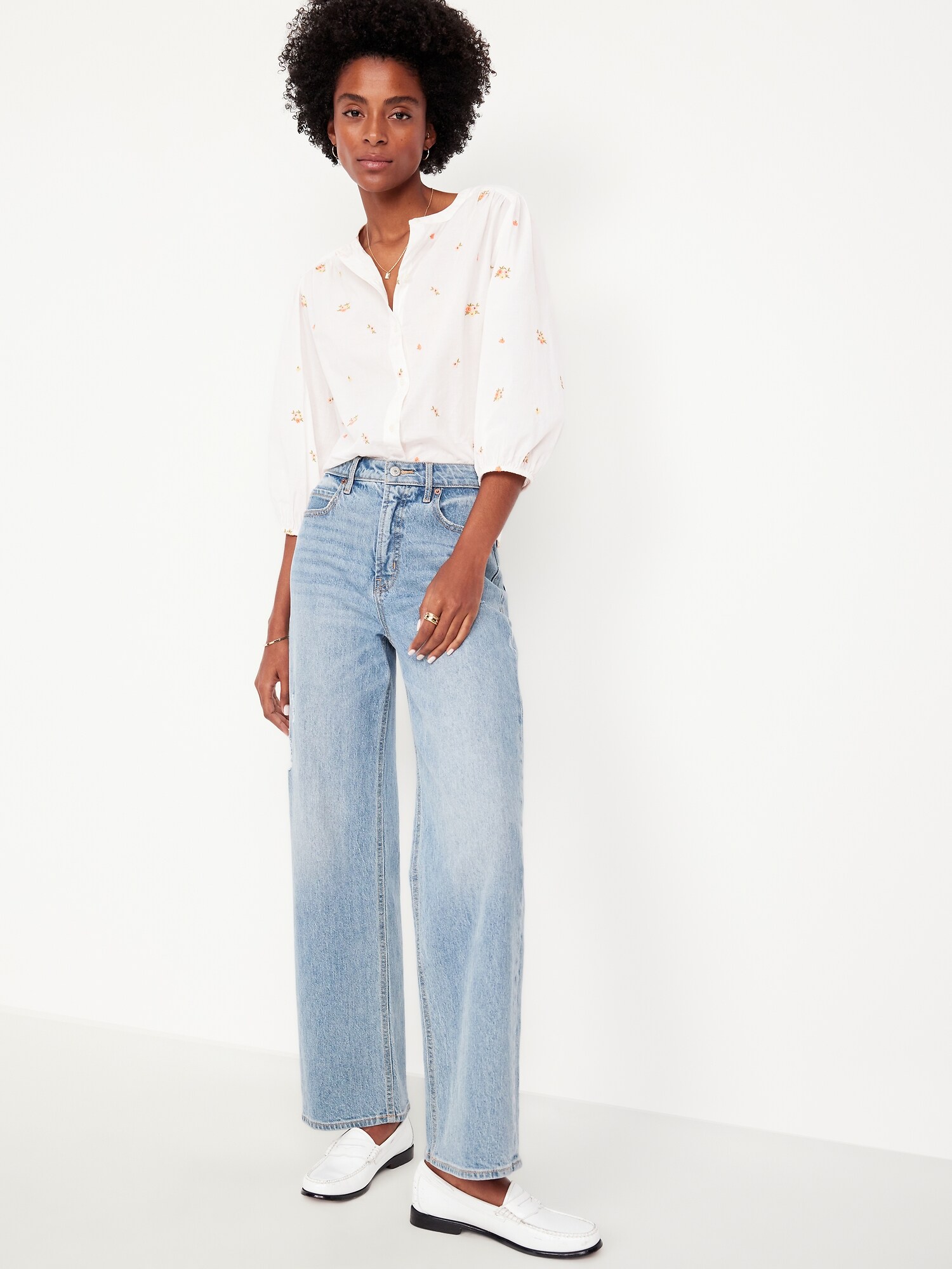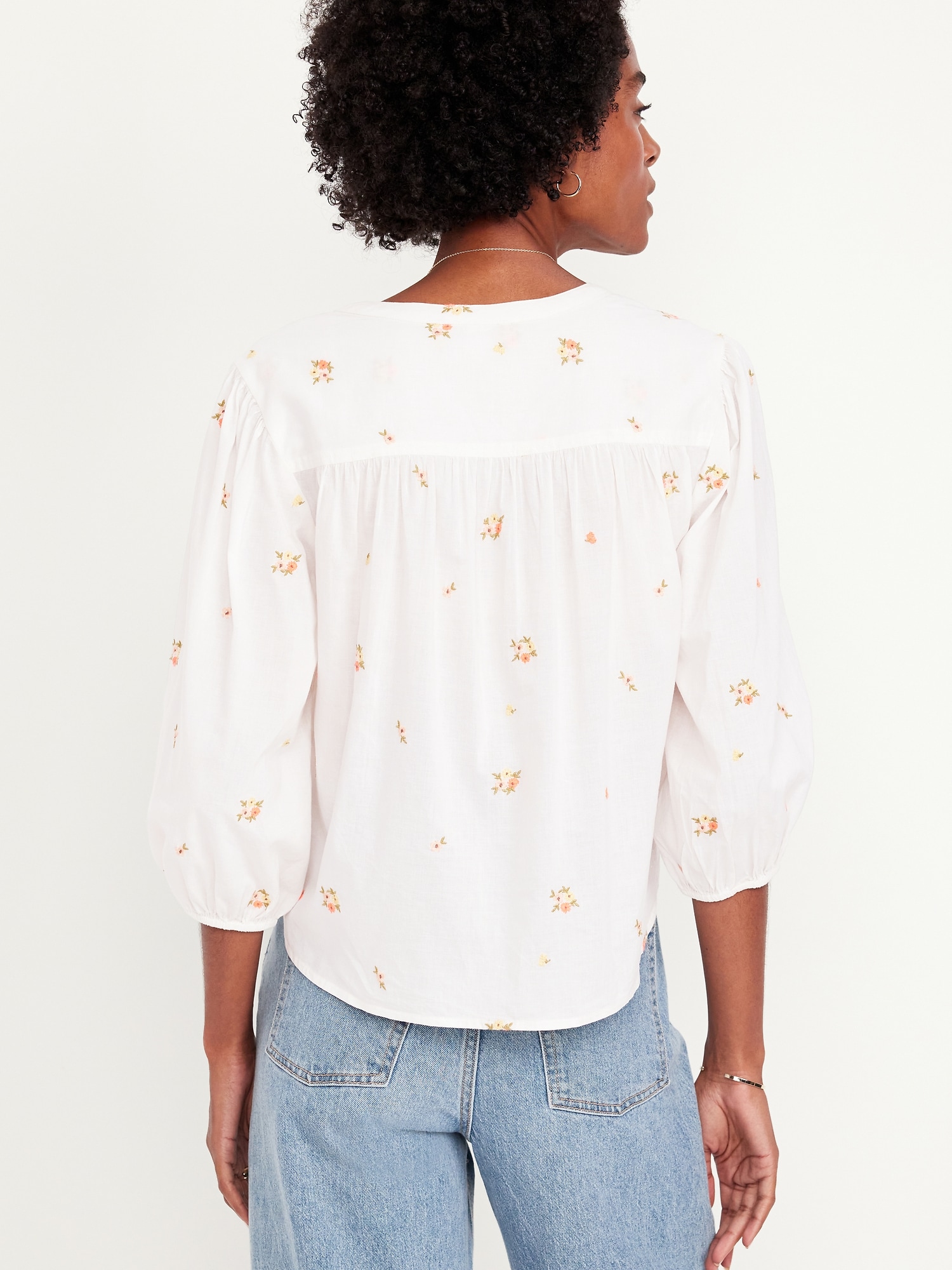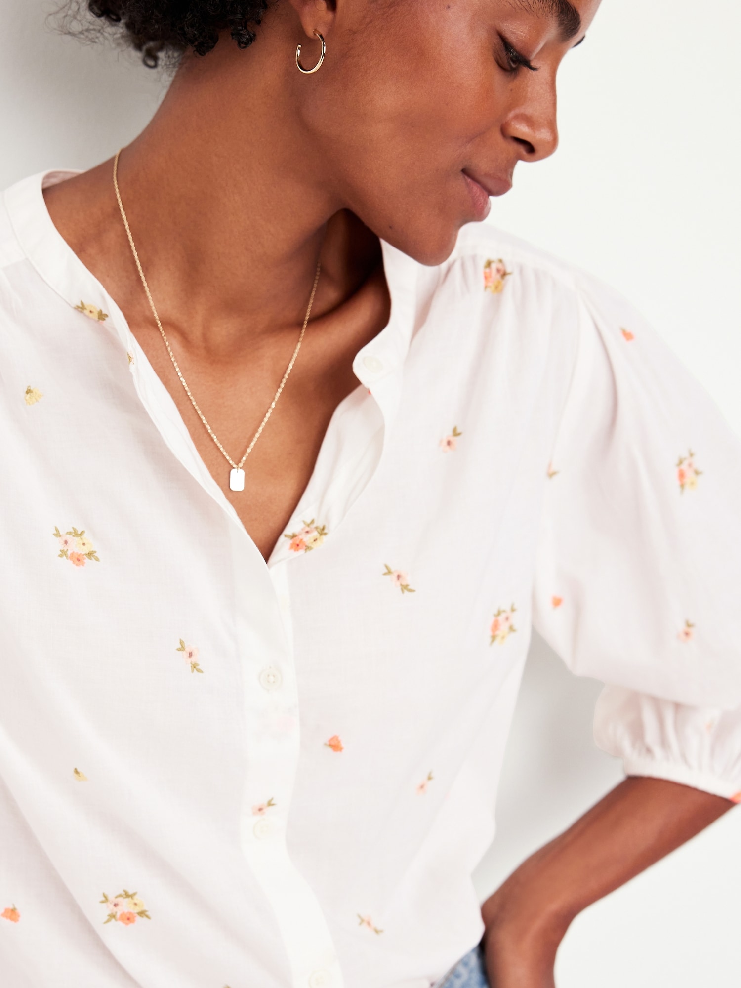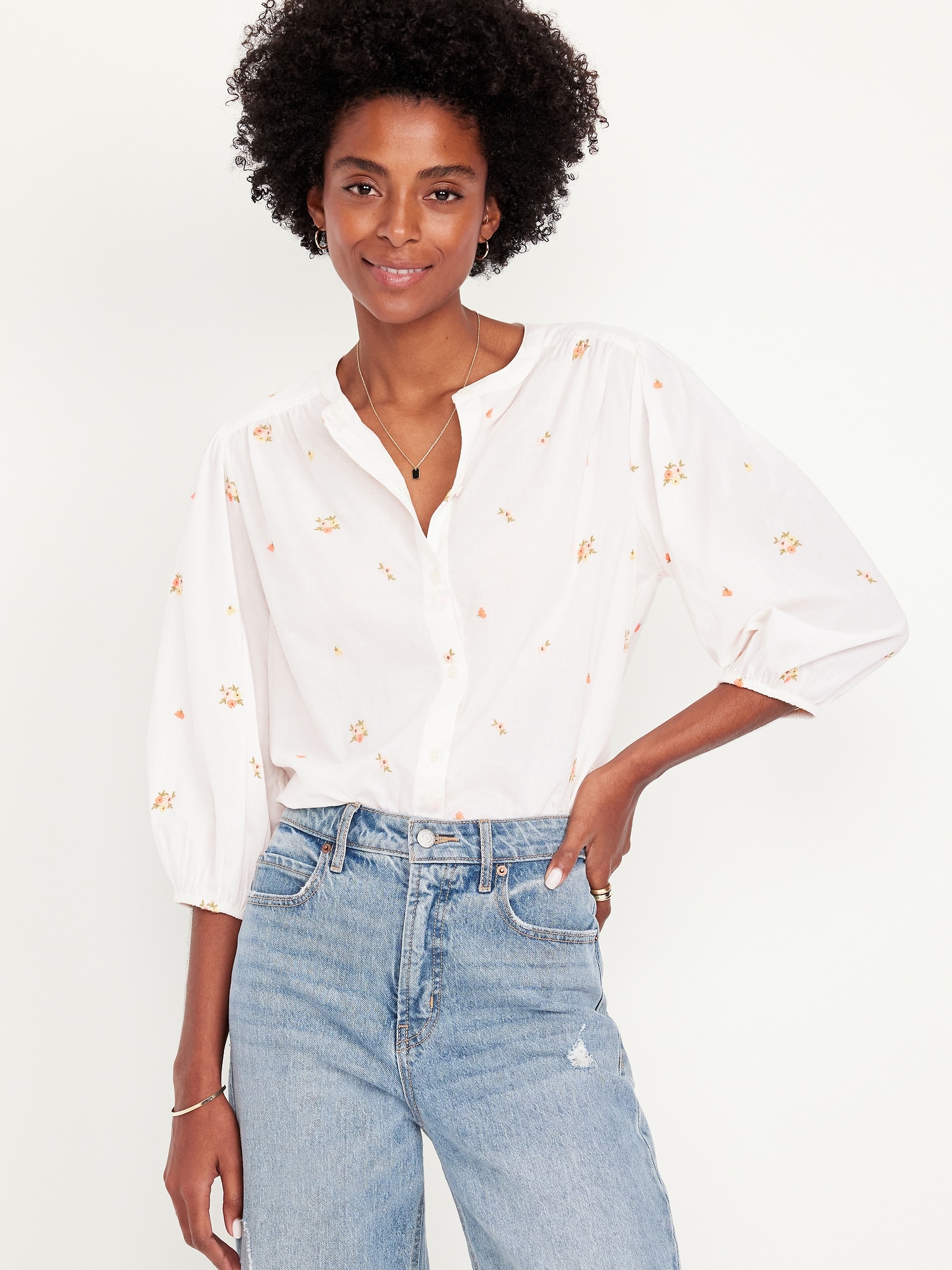 Button-Down Floral Shirt: banded collar, bracelet sleeves, elastic cuffs, full-button front, shirred detail, ditsy floral print, #704713