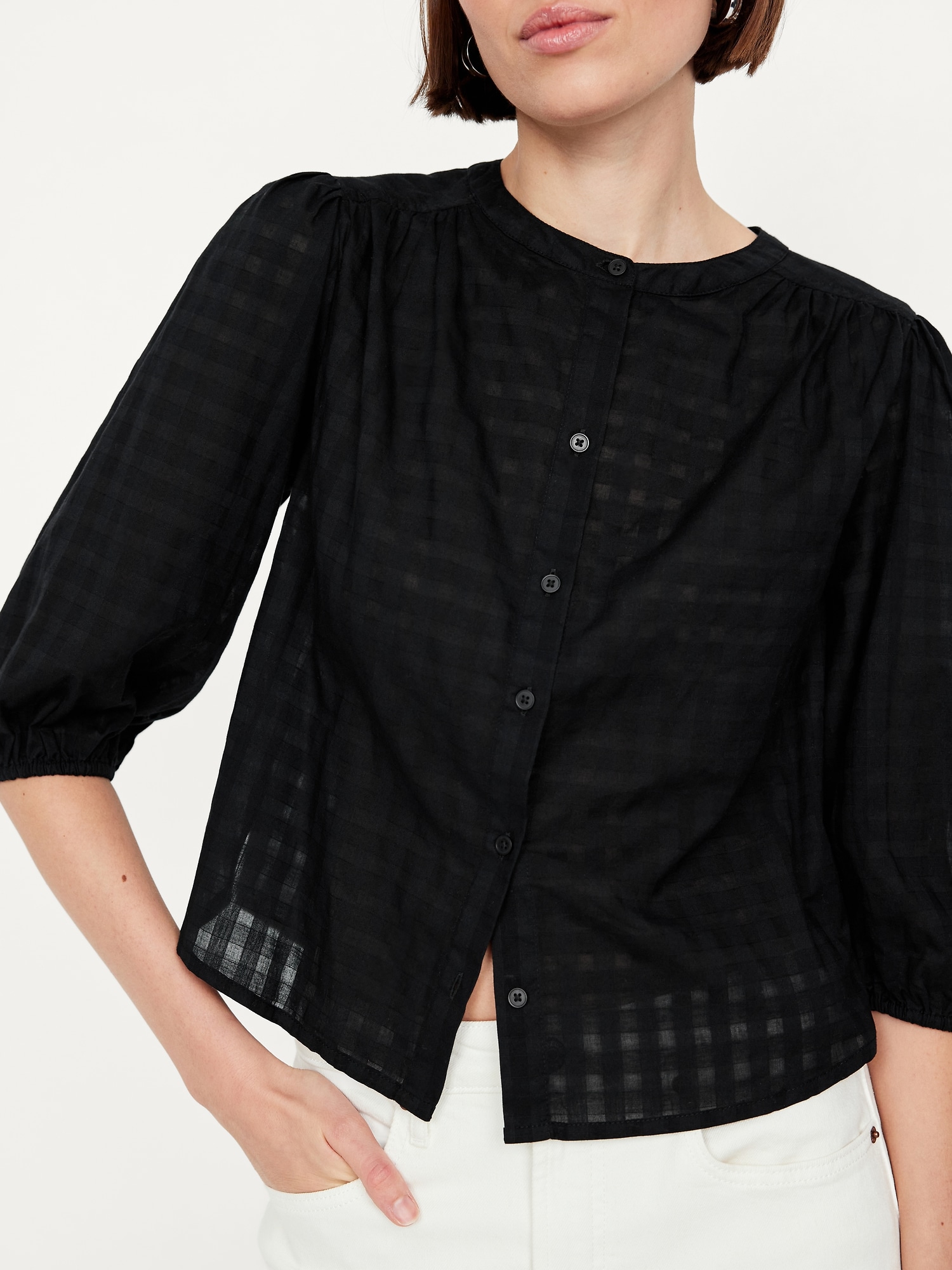 Button-Down Lightweight Dobby Shirt: banded collar, bracelet sleeves, elastic cuffs, full-button front, shirred detail, ditsy floral print, #704713