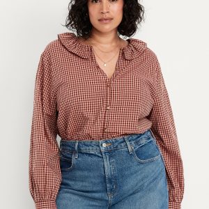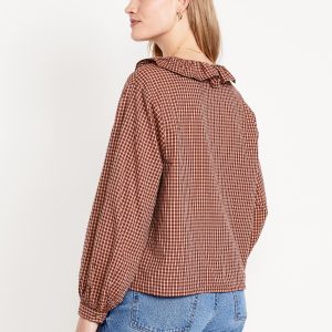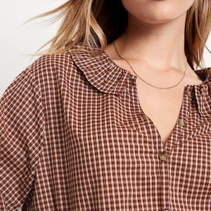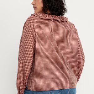 Button-Down Ruffle Shirt: ruffle collar, long sleeves, shirred-button cuffs, full-button front, plaid print, #805732