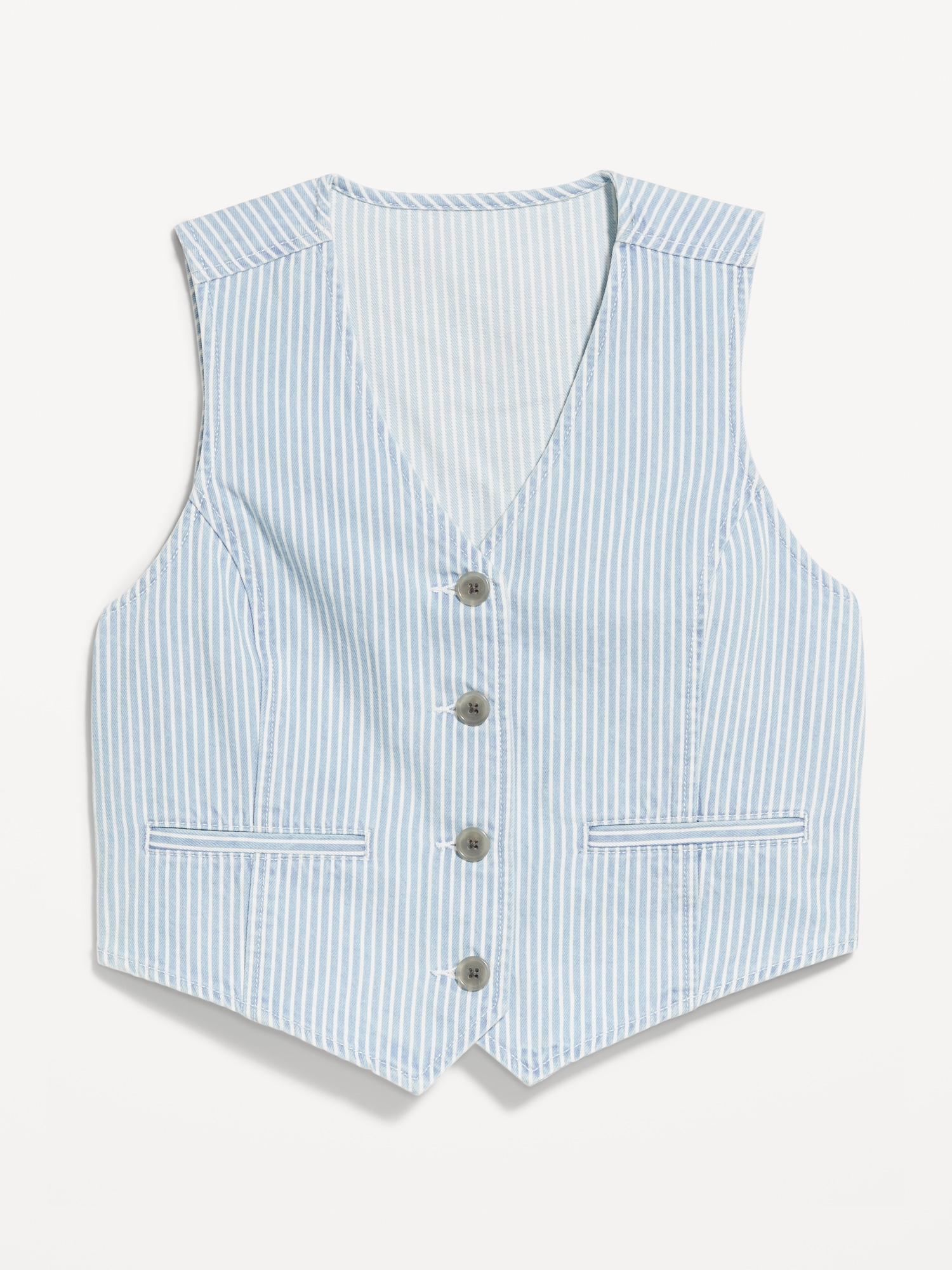 Button-Front Jean Vest: v-neck, four-button front, decorative welt pockets, princess seams, #693819