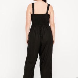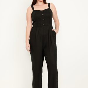 Button-Front Linen-Blend Cami Jumpsuit: sweetheart neckline, wide adjustable straps, four-button front, hip pockets, smocked back, #681202