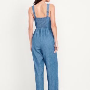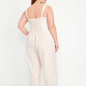 Button-Front Linen-Blend Cami Jumpsuit: sweetheart neckline, wide adjustable straps, four-button front, hip pockets, smocked back, #681202