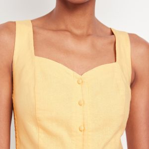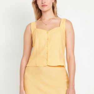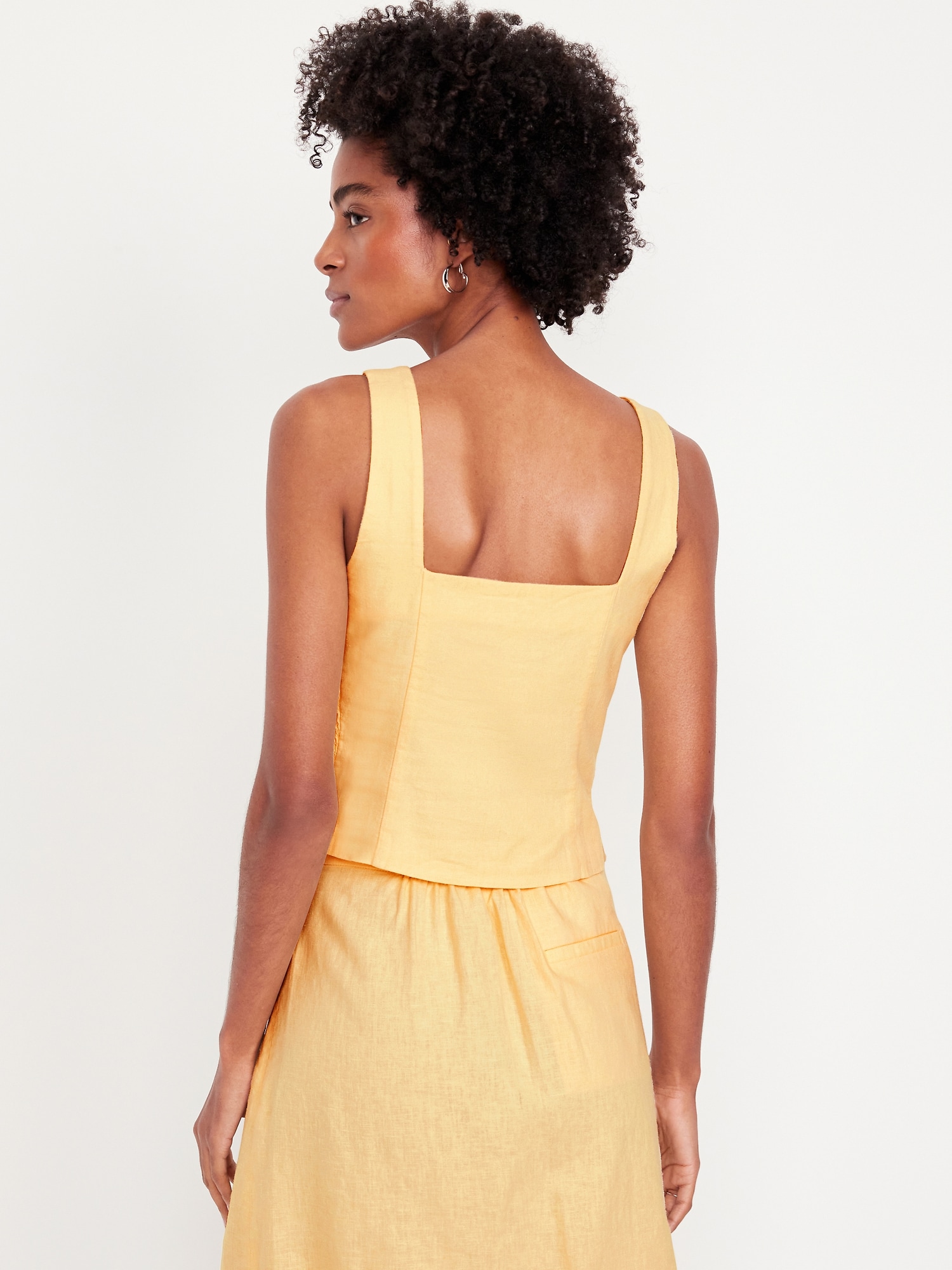 Button-Front Linen-Blend Vest: sweetheart neckline, wide straps, five-button front, smocked side panels, princess seams, #704063