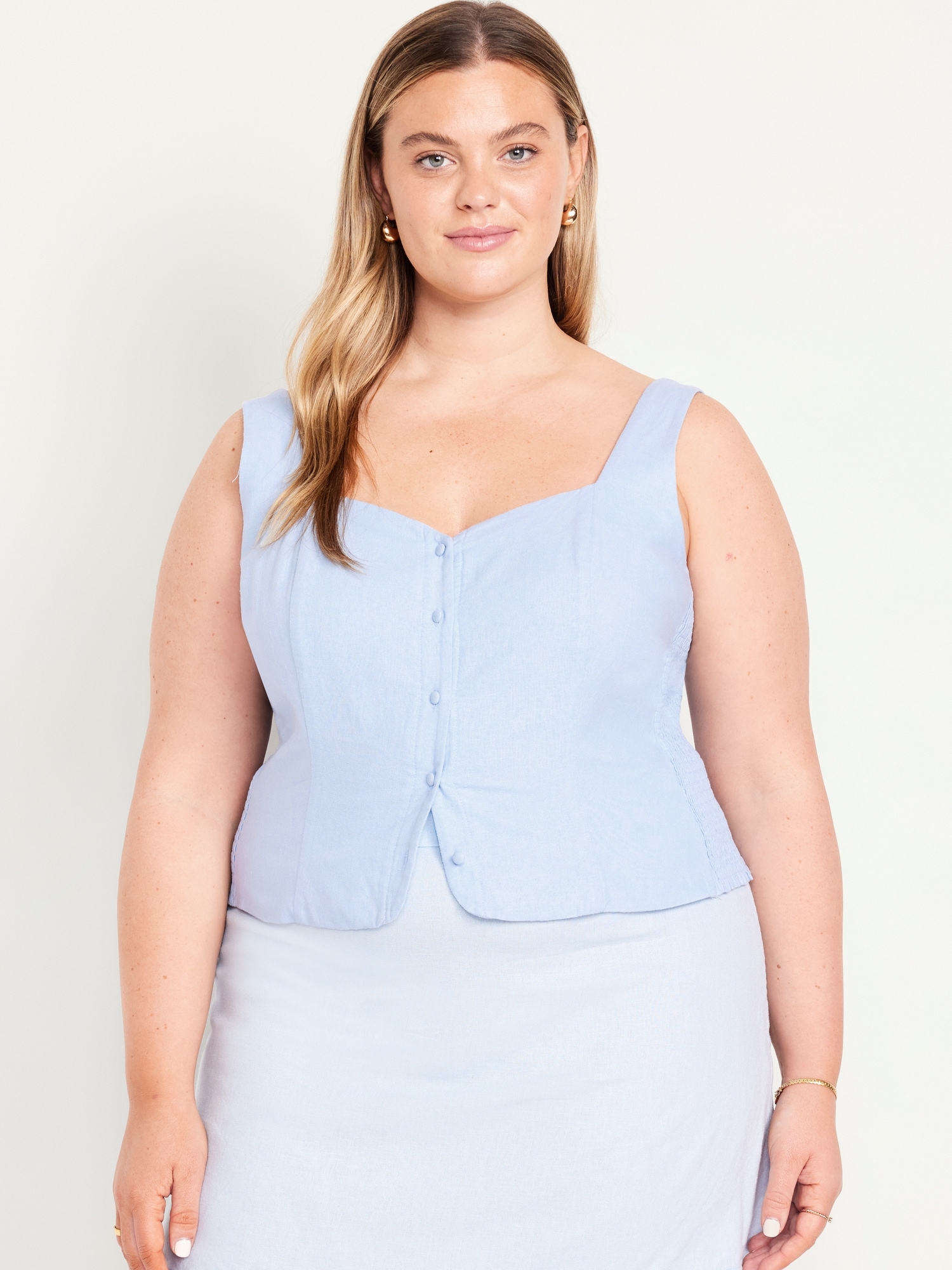Button-Front Linen-Blend Vest: sweetheart neckline, wide straps, five-button front, smocked side panels, princess seams, striped print, #704099