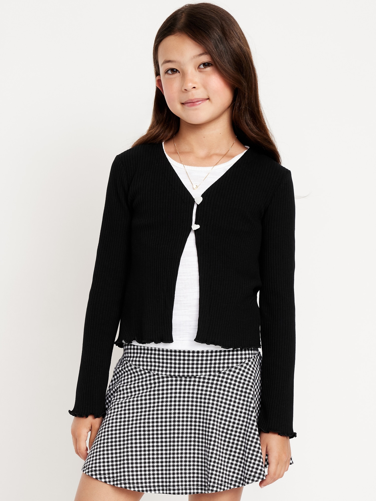 Button-Front Ribbed Cardigan for Girls: v neck, heart shaped button loop closures, long sleeves, lettuce edge cuffs and hem, #766942
