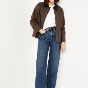 Canvas Barn Jacket: corduroy collar, long sleeves with snap cuffs, full-snap front with hidden zipper, patch pockets, #766357