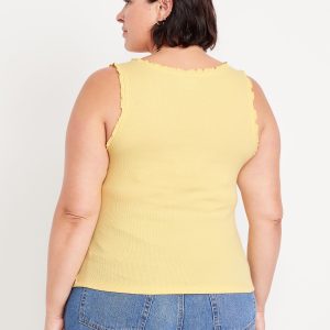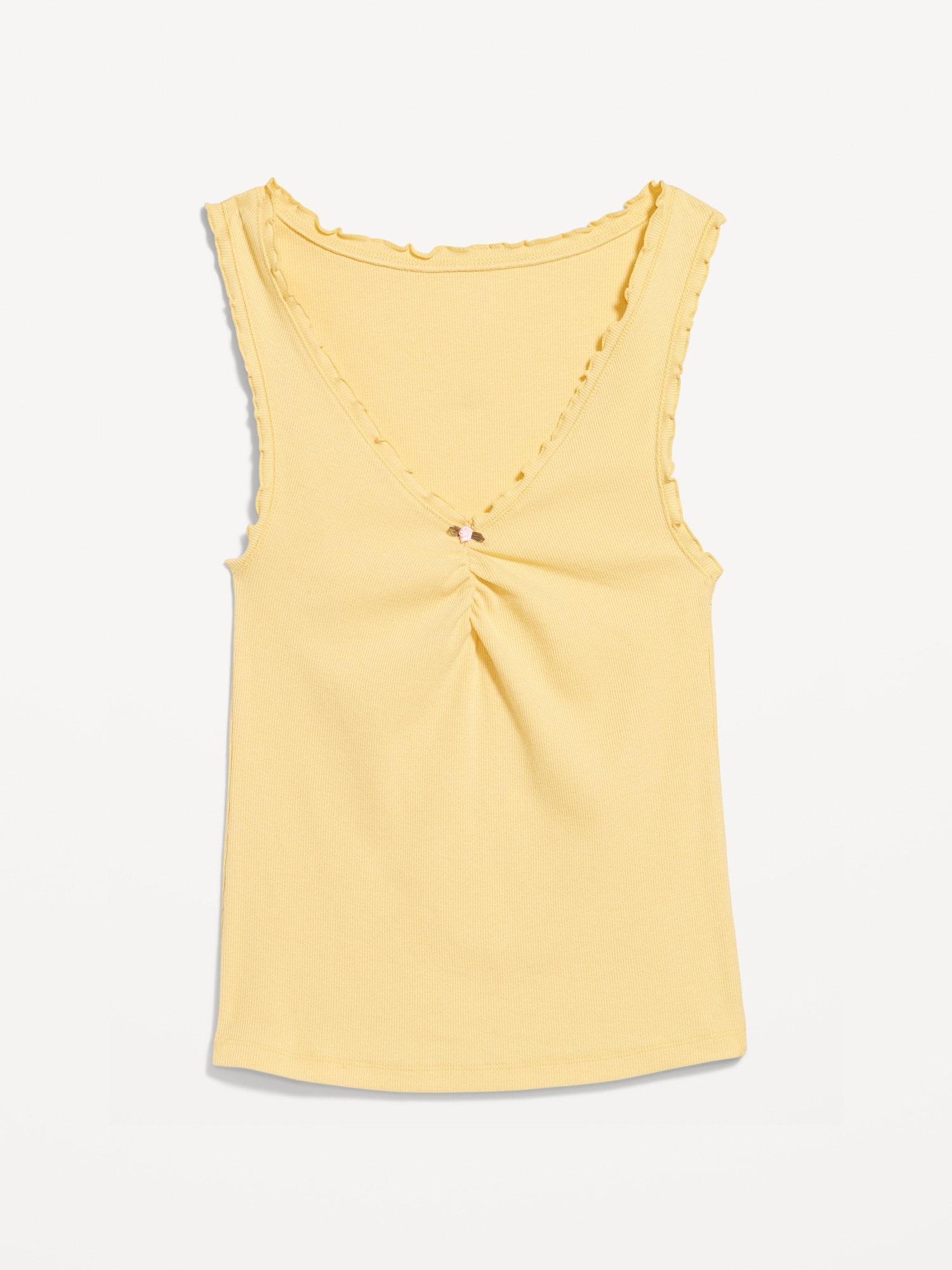 Cinched Rib-Knit Tank Top: deep v-neck, wide ruffled straps, cinched front with rosette applique, #791559