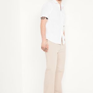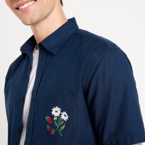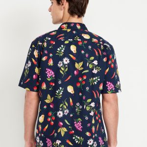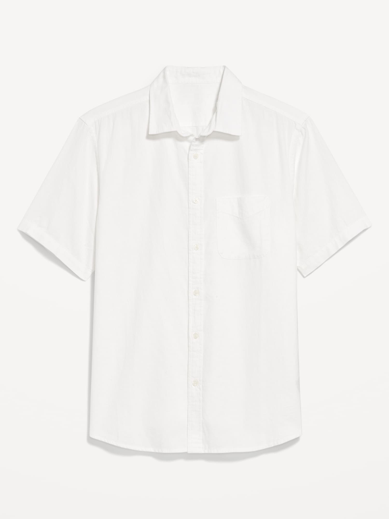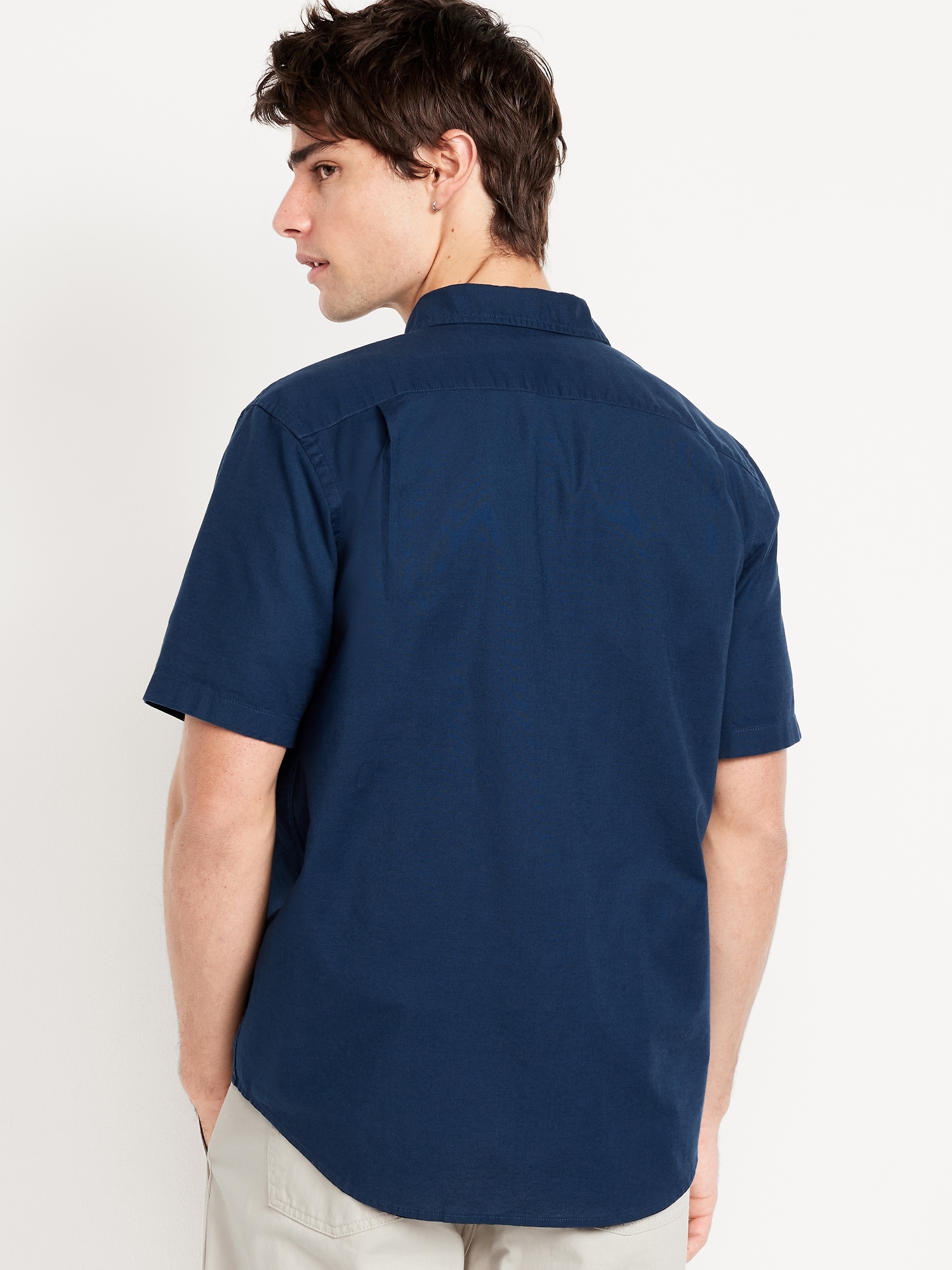Classic Fit Everyday Linen-Blend Shirt: spread collar, short sleeves, full-button front, patch chest pocket, prints vary, #807396