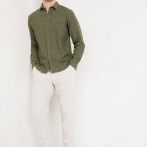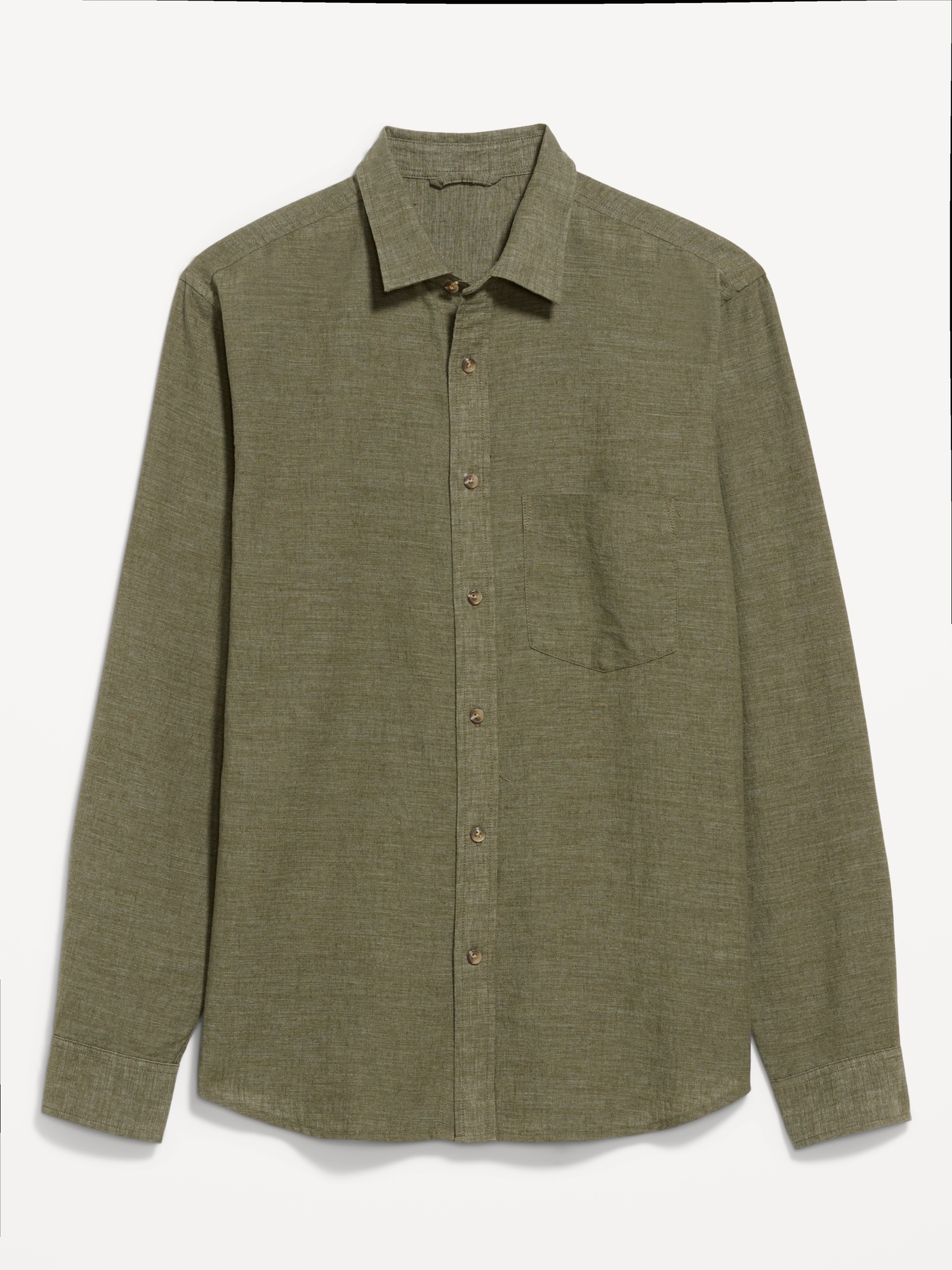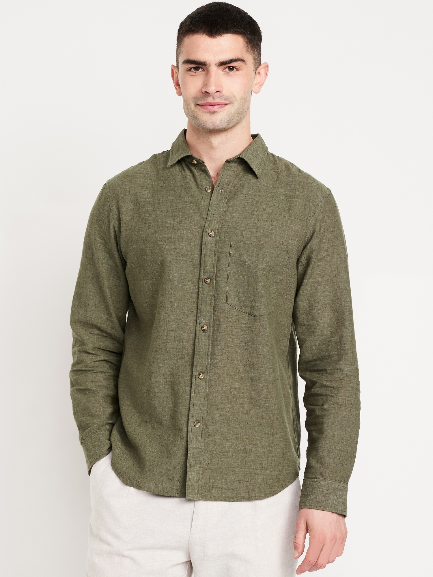 Classic Fit Linen-Blend Shirt: spread collar, long sleeves, buttoned cuffs, full-button front, patch chest pocket, #691163
