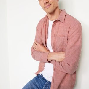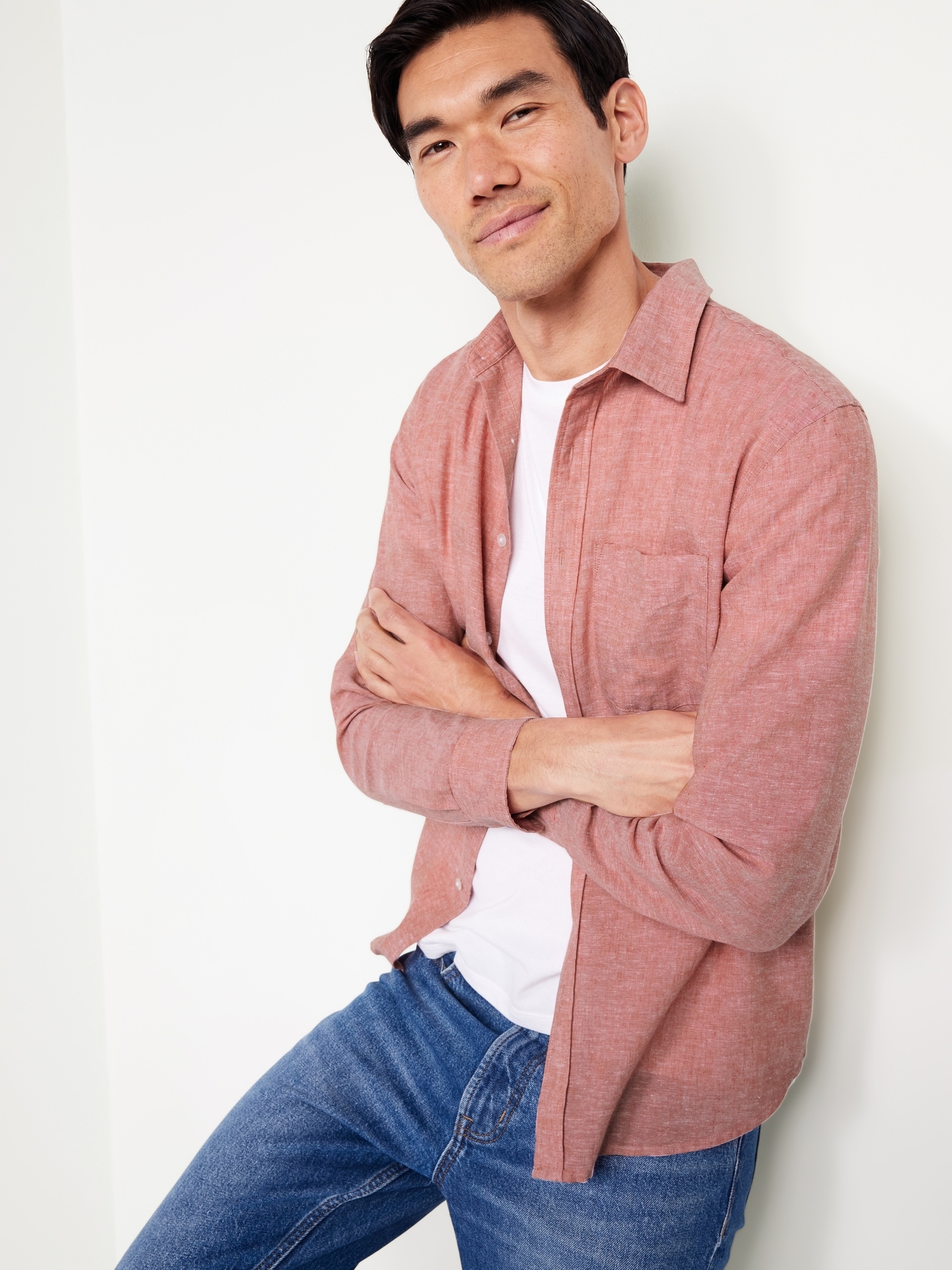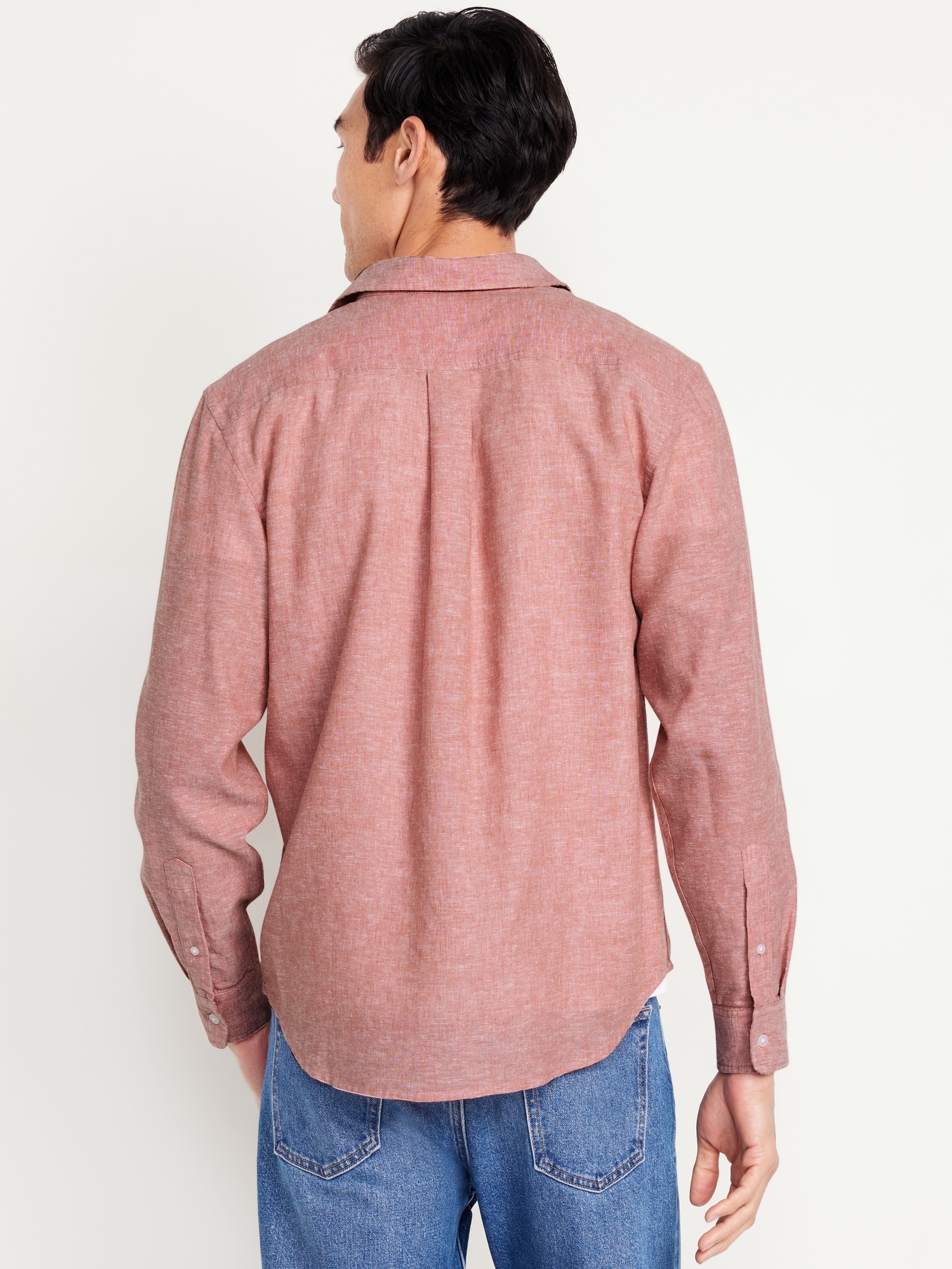 Classic Fit Linen-Blend Shirt: spread collar, long sleeves, buttoned cuffs, full-button front, patch chest pocket, #691163