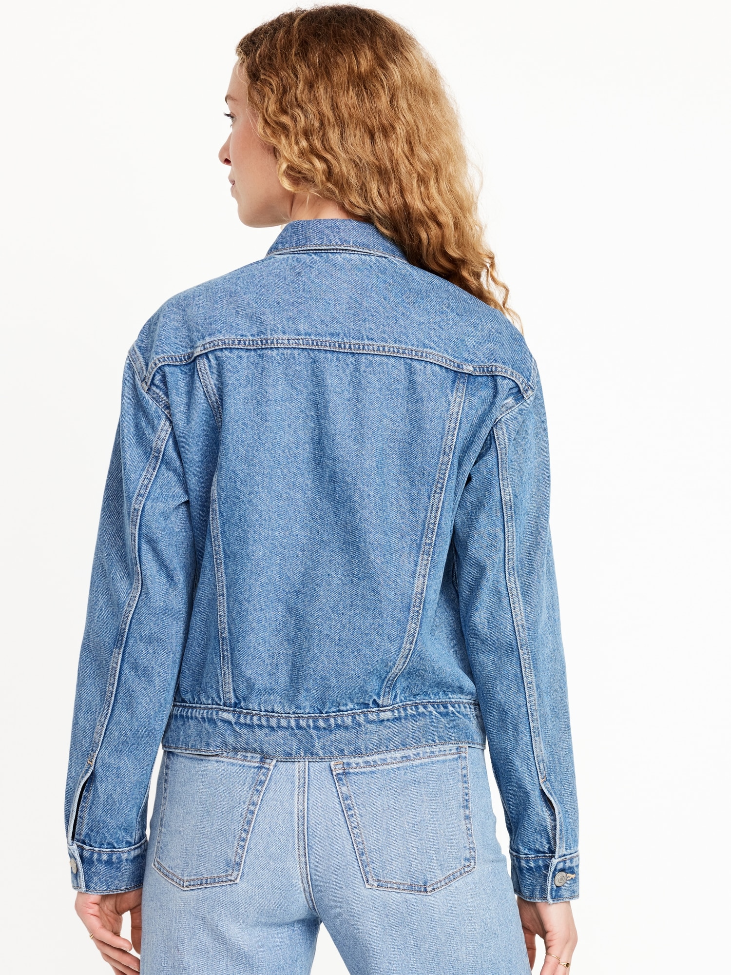 Classic Jean Jacket: spread collar, long sleeves, buttoned cuffs, flap-button chest pockets, on-seam front pockets, full-button front, banded hem, adjustable button tabs at back waist, #467752