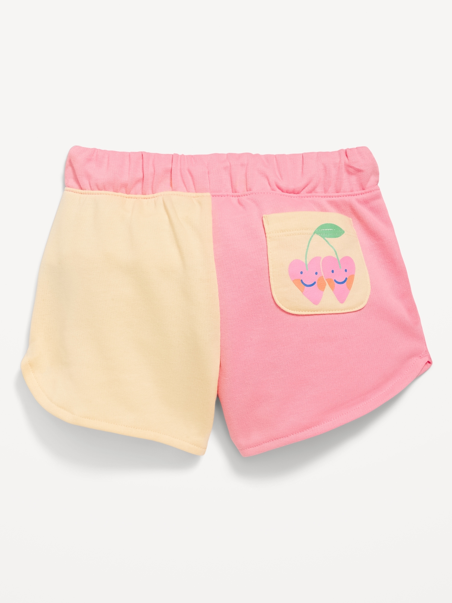 Color-Block Graphic French-Terry Shorts for Toddler Girls: elasticized waistband, functional drawstring, diagonal on-seam pockets, small-scale logo graphic, dolphin hem, #690582