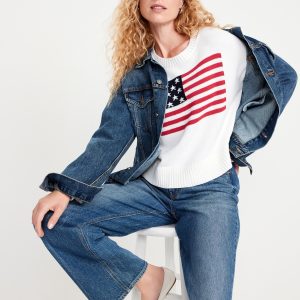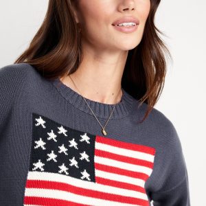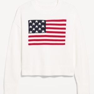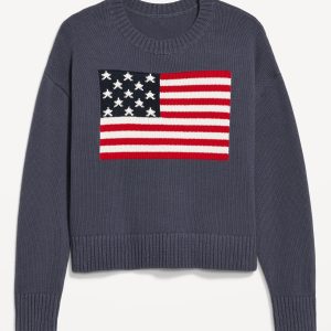 Crew-Neck Flag-Graphic Sweater: crew neck, long sleeves, front flag graphic, rib-knit trim, pullover style, #672986