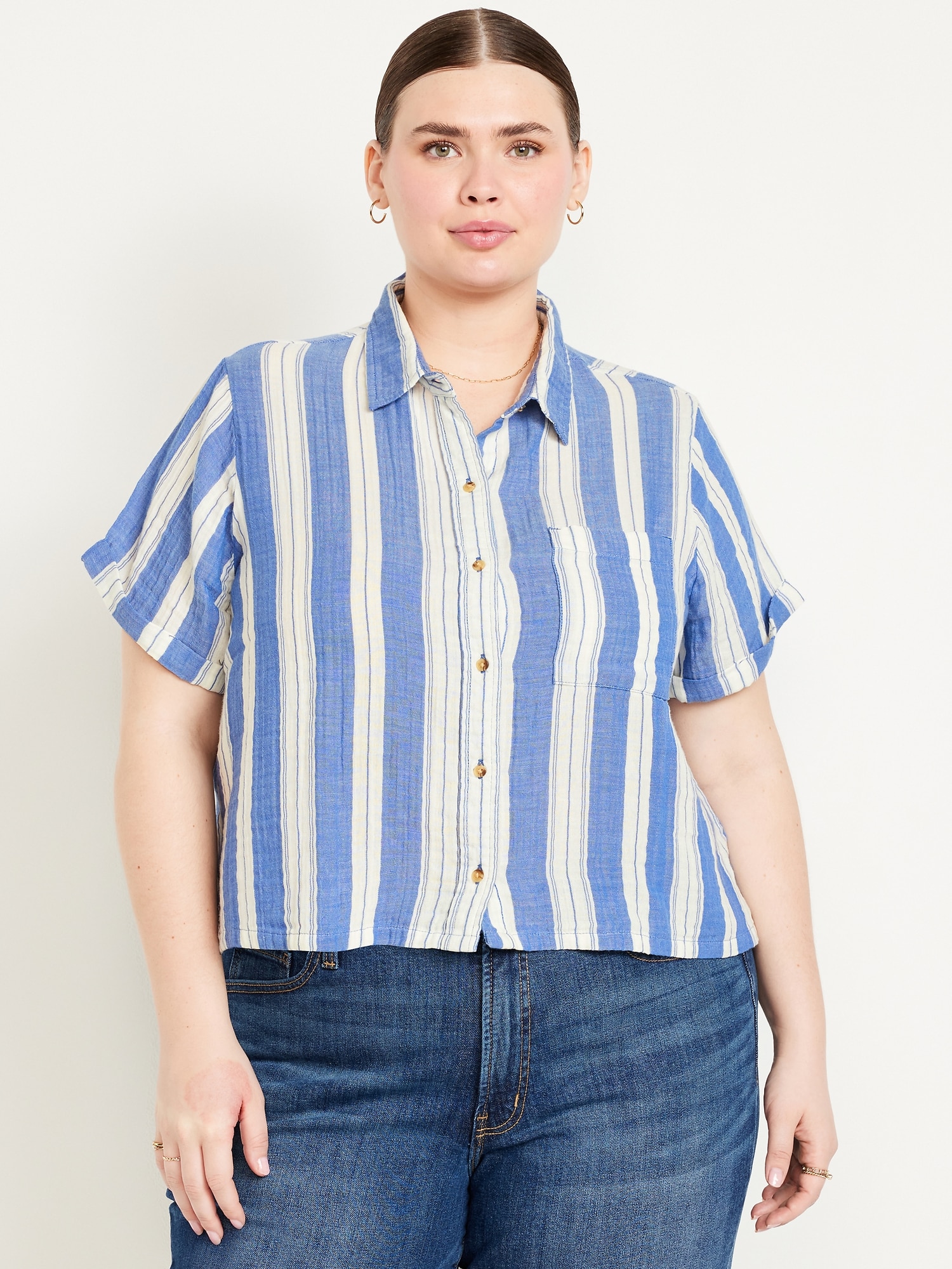 Crinkle Gauze Button-Down Striped Shirt: Drapey, laid-back and ready for the breeze.spread collar, short sleeves, full-button front, seamed back yoke, #704203