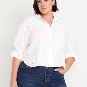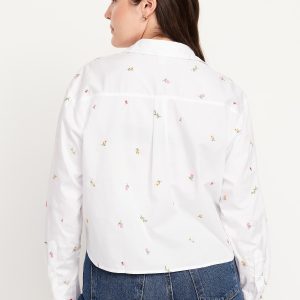 Cropped Button-Down Shirt: spread collar, long sleeves with buttoned cuffs, full-button front, patch chest pocket, vertical striped print, #825106