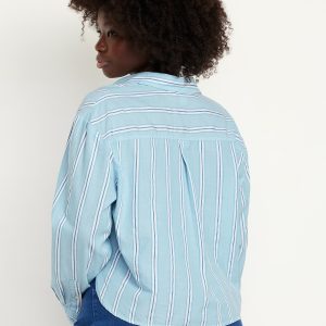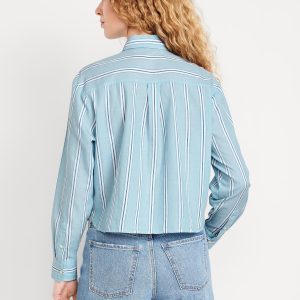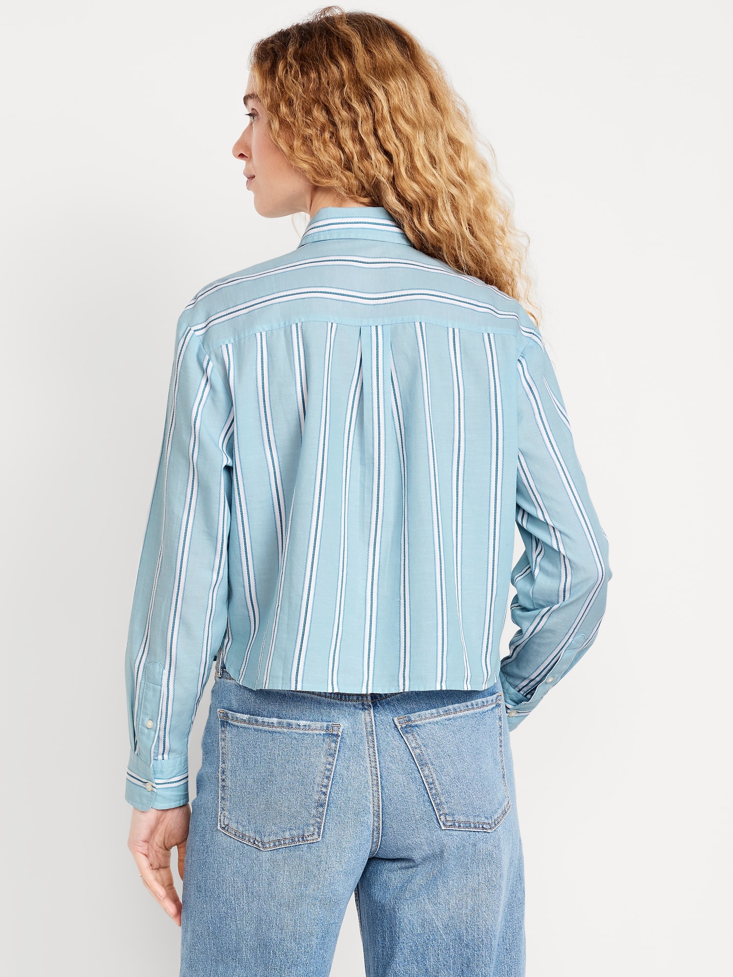 Cropped Button-Down Striped Shirt: spread collar, long sleeves with buttoned cuffs, full-button front, patch chest pocket, vertical striped print, #825106
