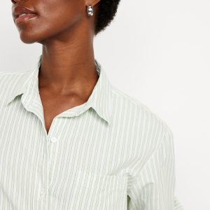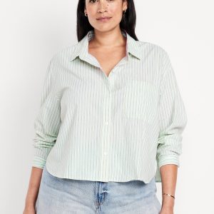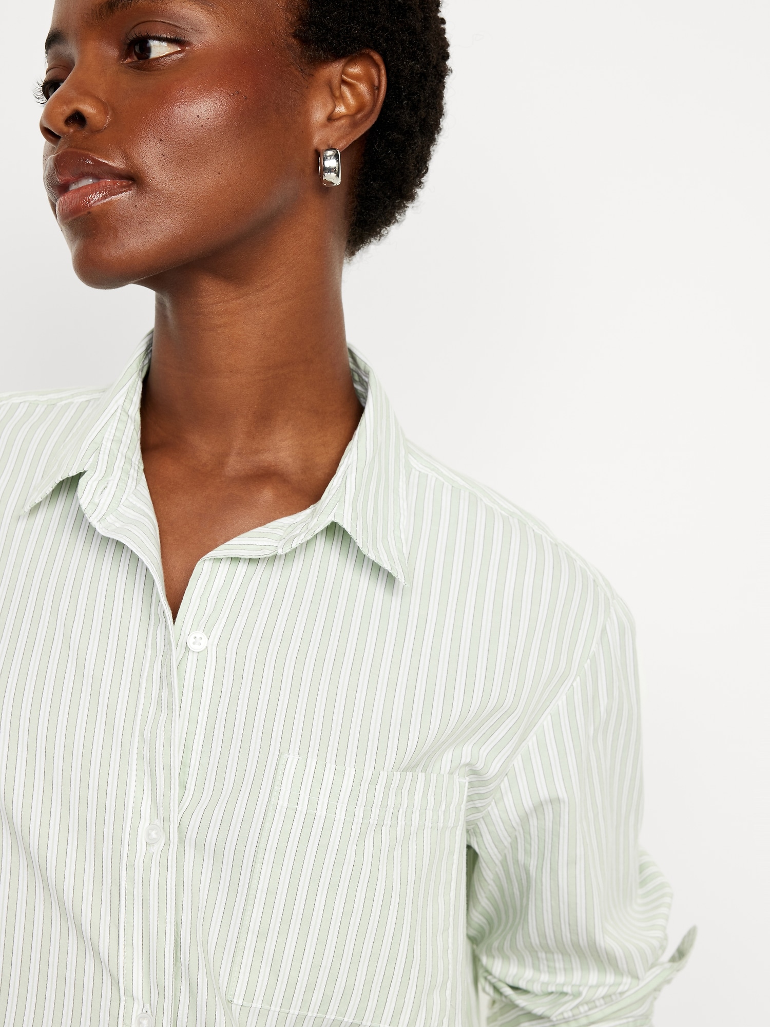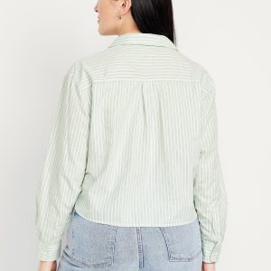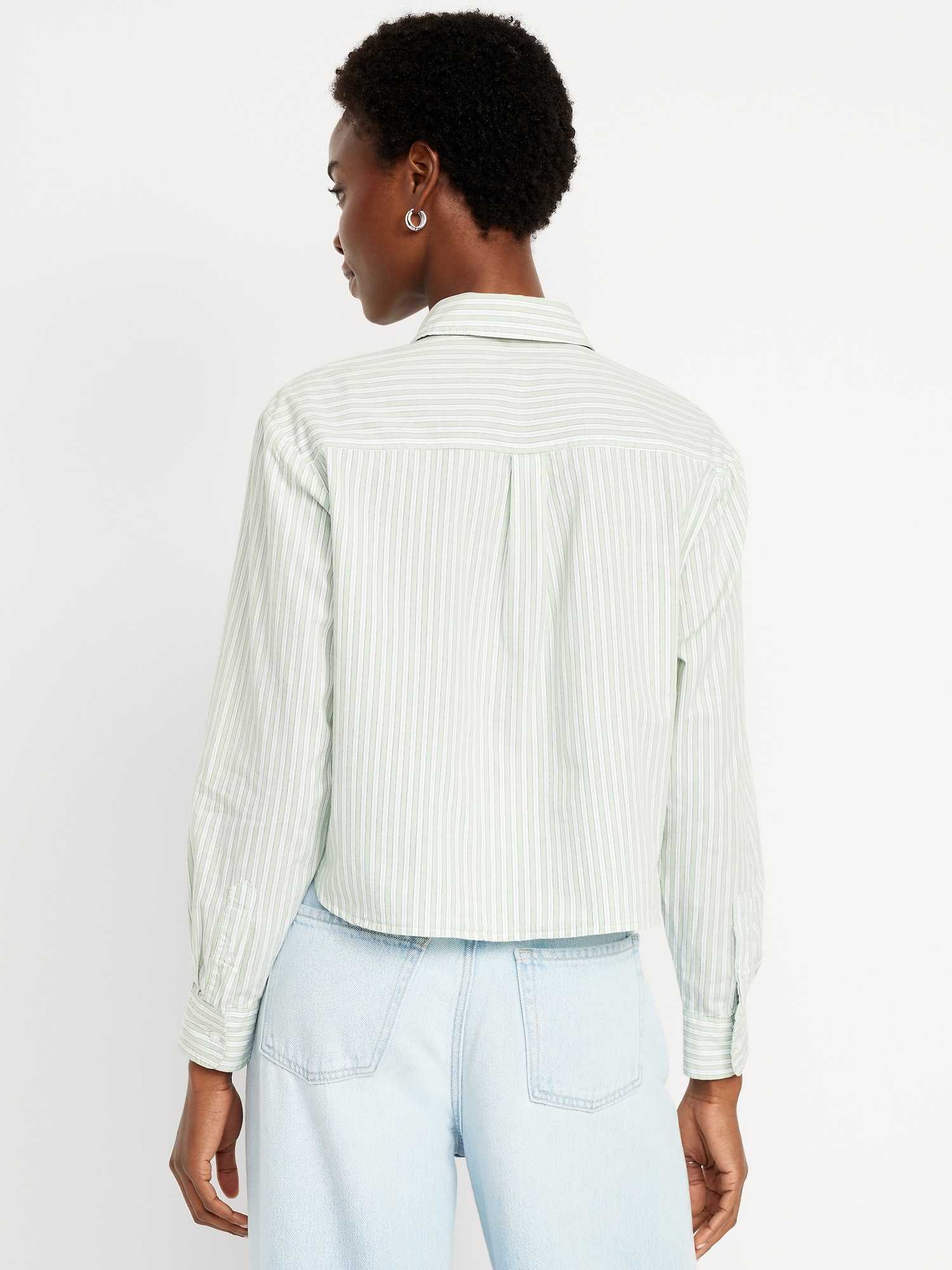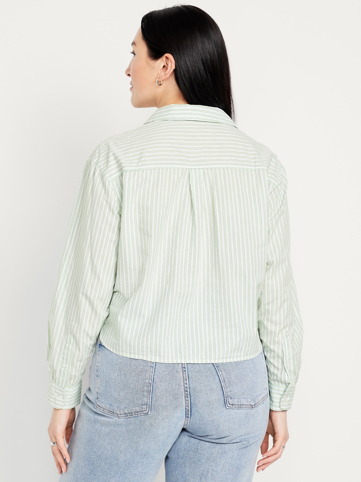 Cropped Button-Down Striped Shirt: spread collar, long sleeves with buttoned cuffs, full-button front, patch chest pocket, vertical striped print, #825106