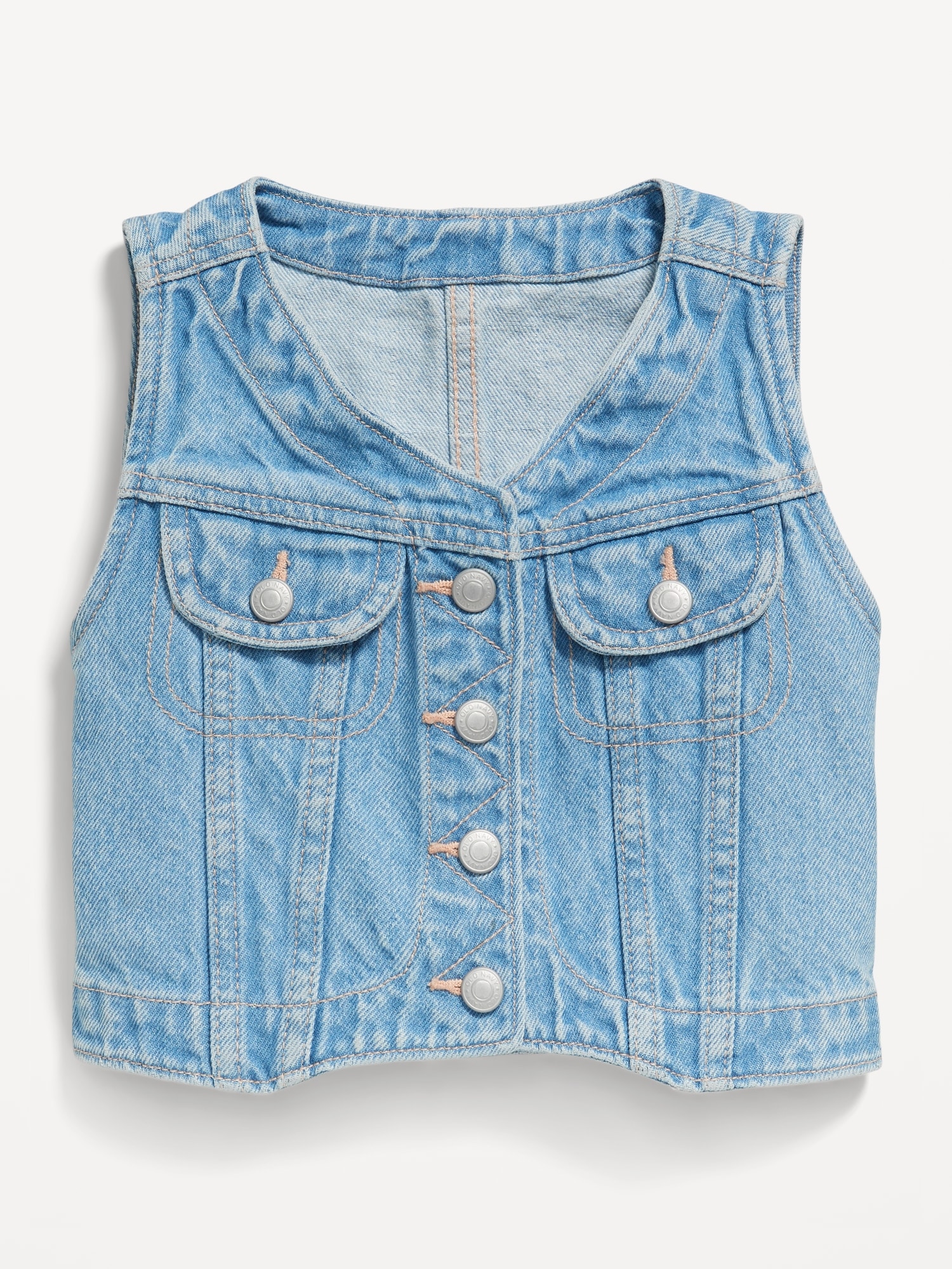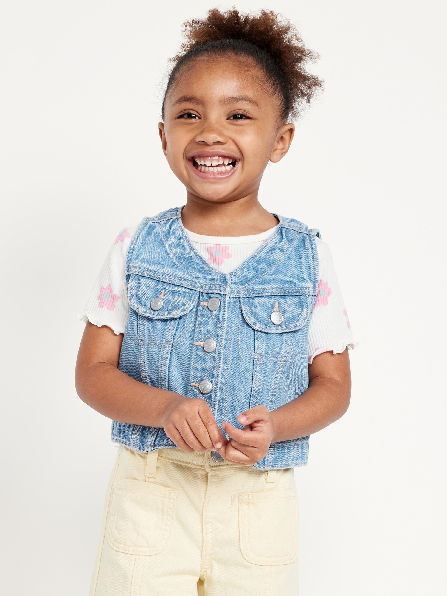 Cropped Jean Vest for Toddler Girls: v neck, sleeveless, full-length button front, decorative buttoned pockets at chest, #693443