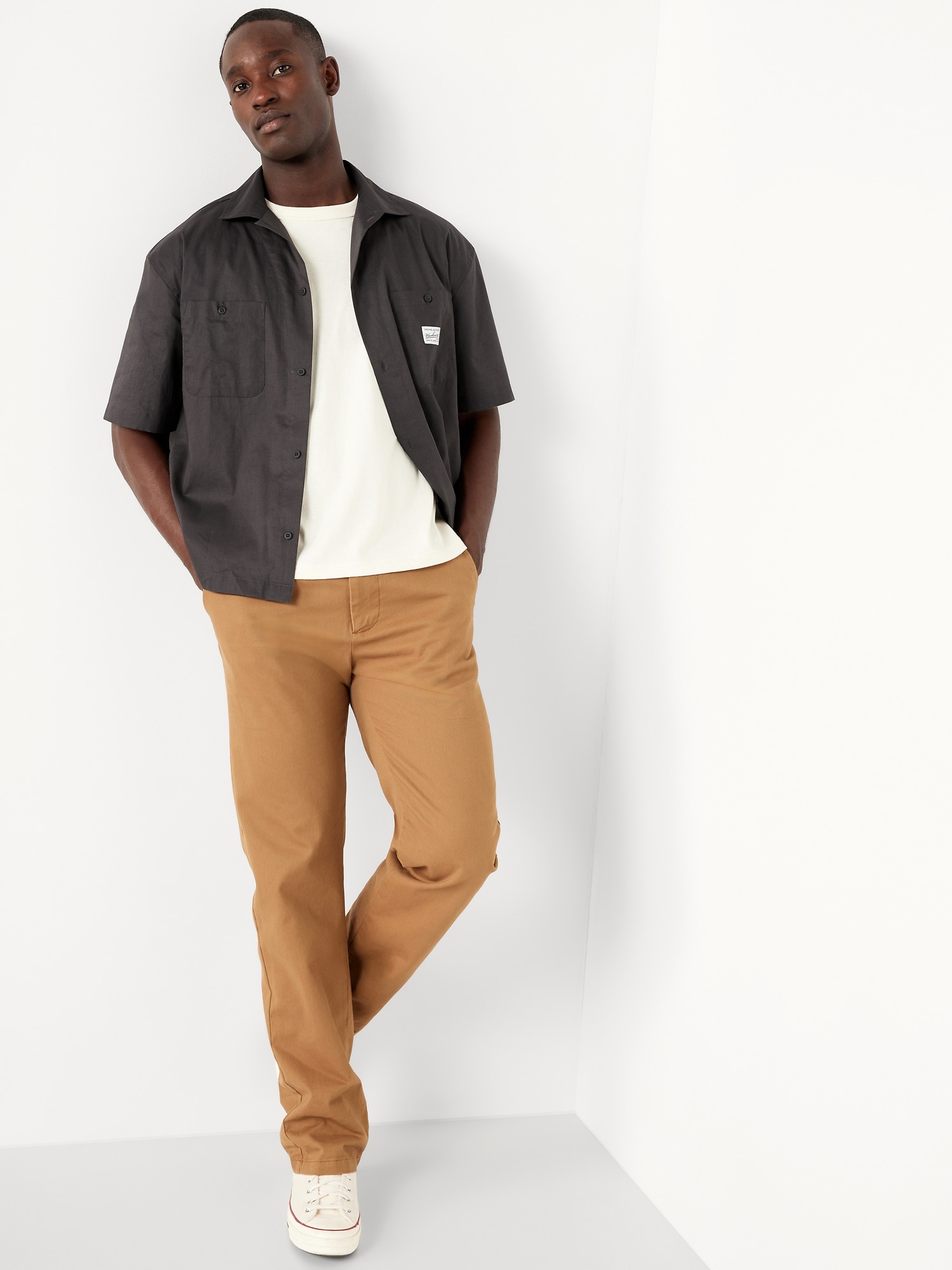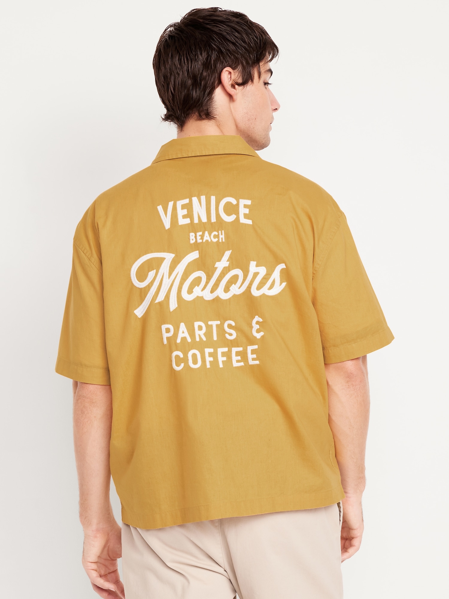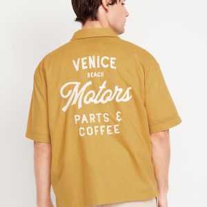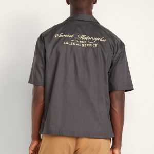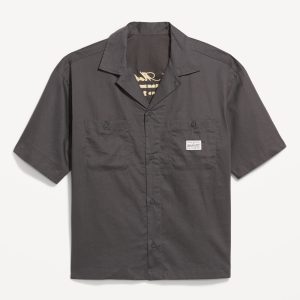 Cropped Utility Pocket Shirt: notched collar, short sleeves, embroidered chest graphic varies, button-patch chest pockets, full-button front, #762369