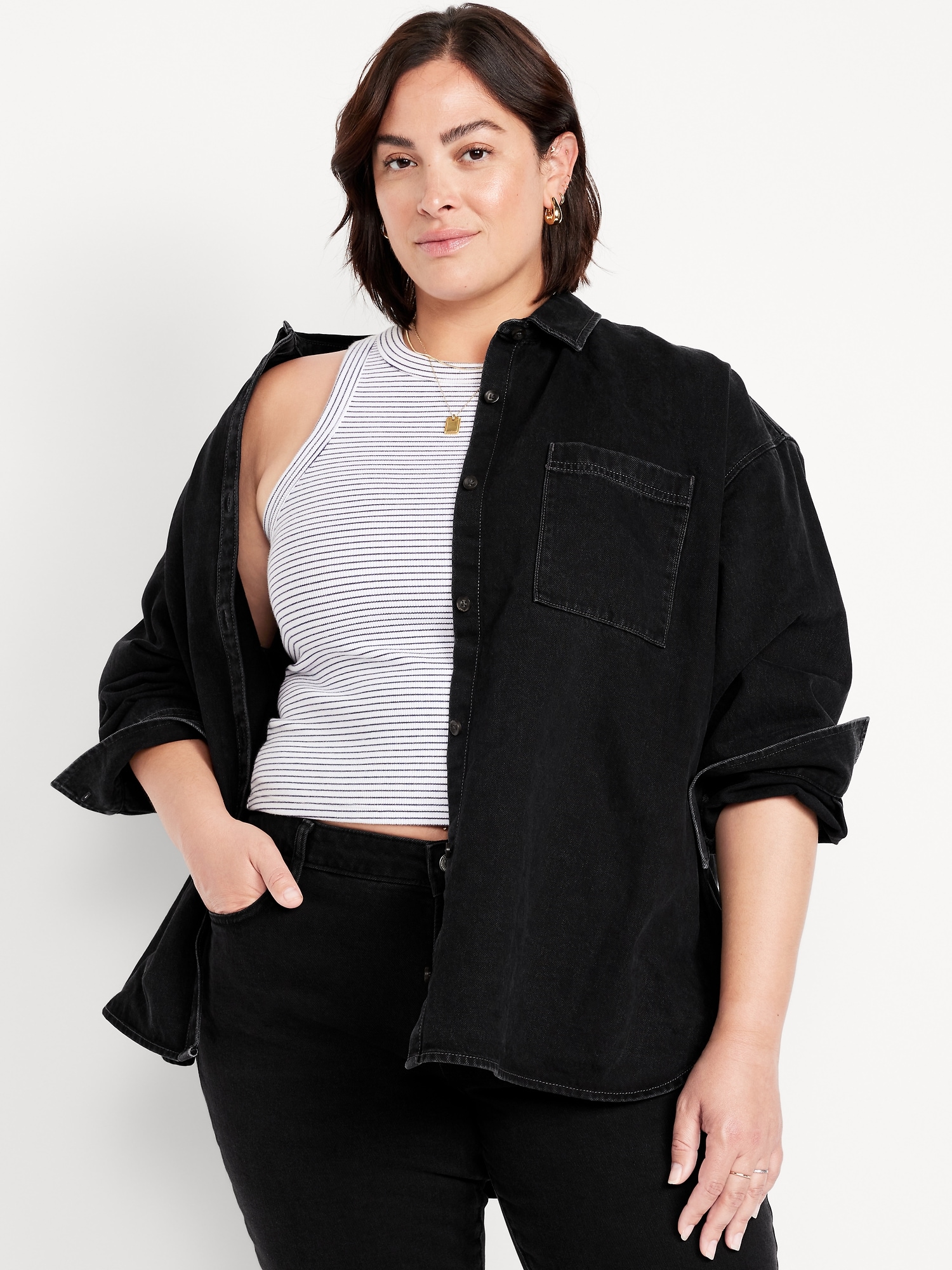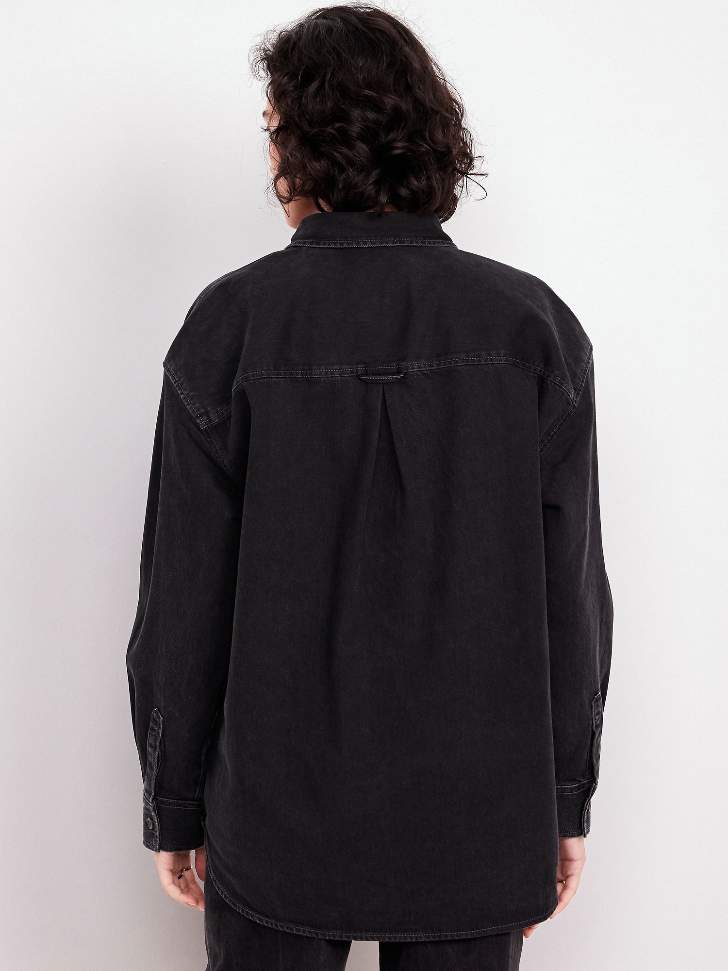 Denim Button-Down Boyfriend Shirt: spread collar, long sleeves with buttoned cuffs, patch chest pocket, full-button front, #800071