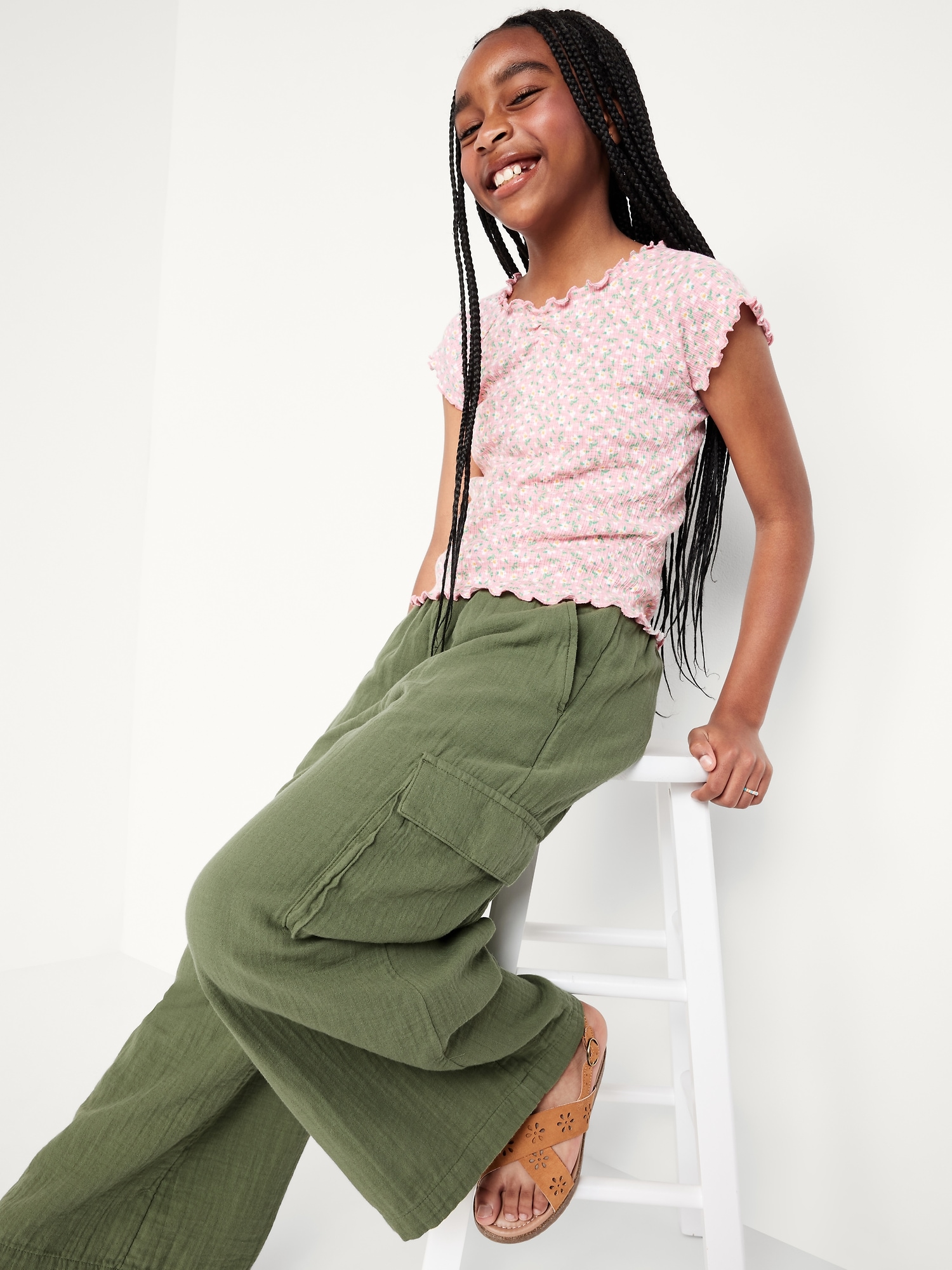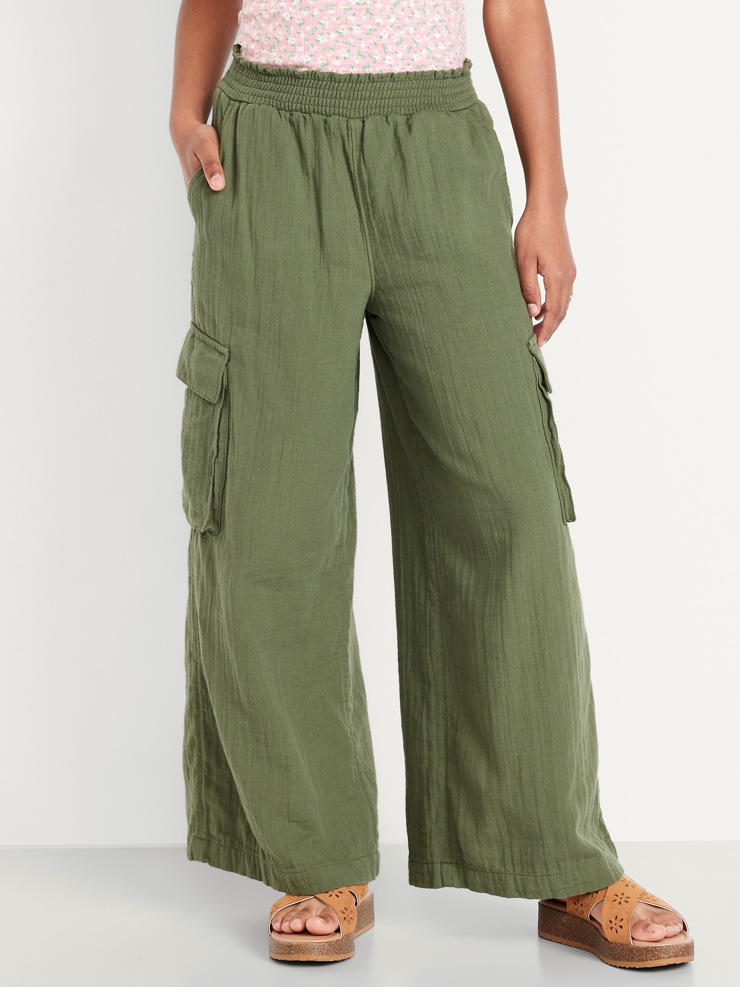 Double-Weave Wide-Leg Cargo Pants for Girls: elasticized waistband, diagonal on-seam pockets, flap cargo pockets, wide leg, #767126