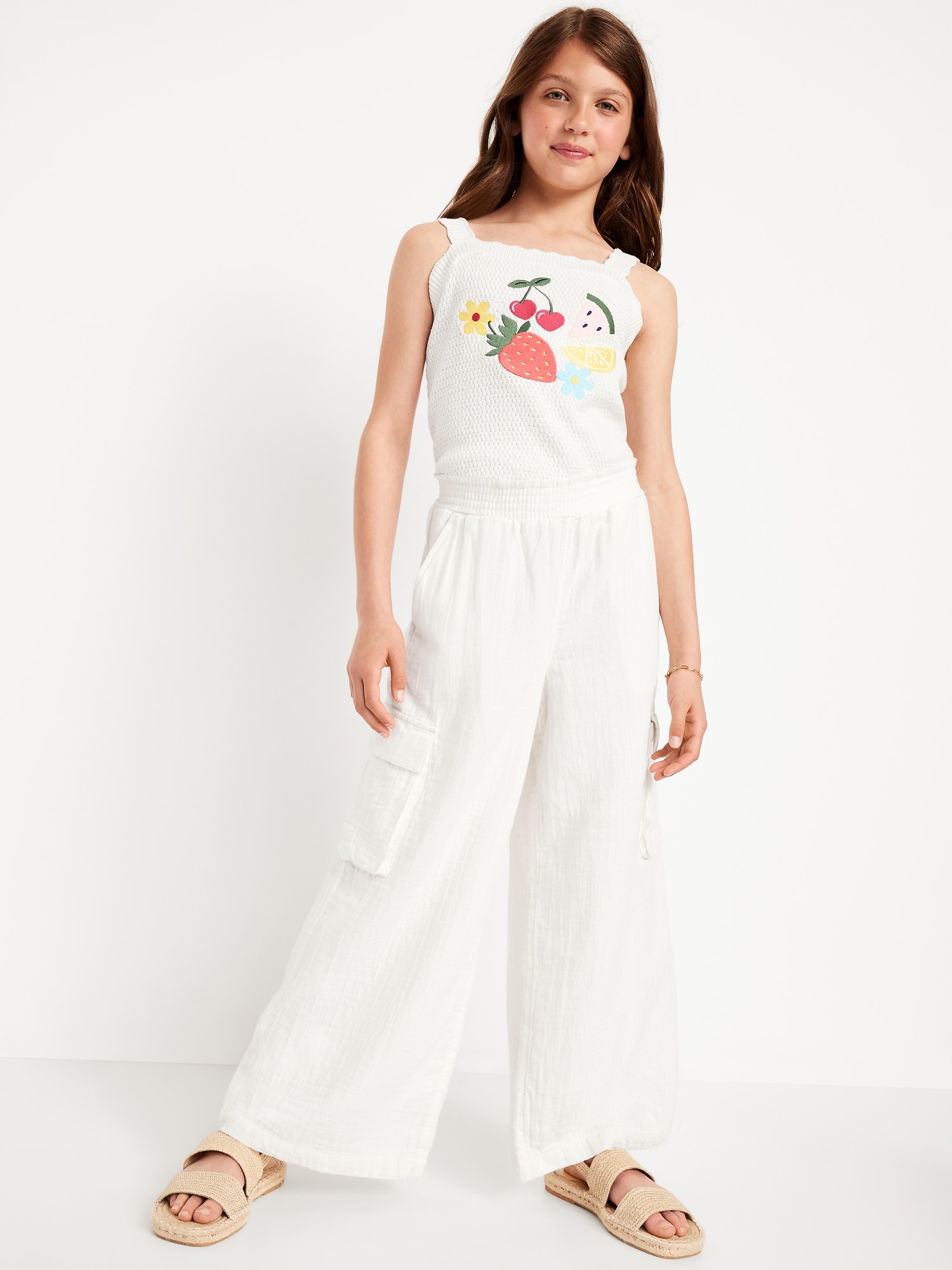 Double-Weave Wide-Leg Cargo Pants for Girls: elasticized waistband, diagonal on-seam pockets, flap cargo pockets, wide leg, #767126