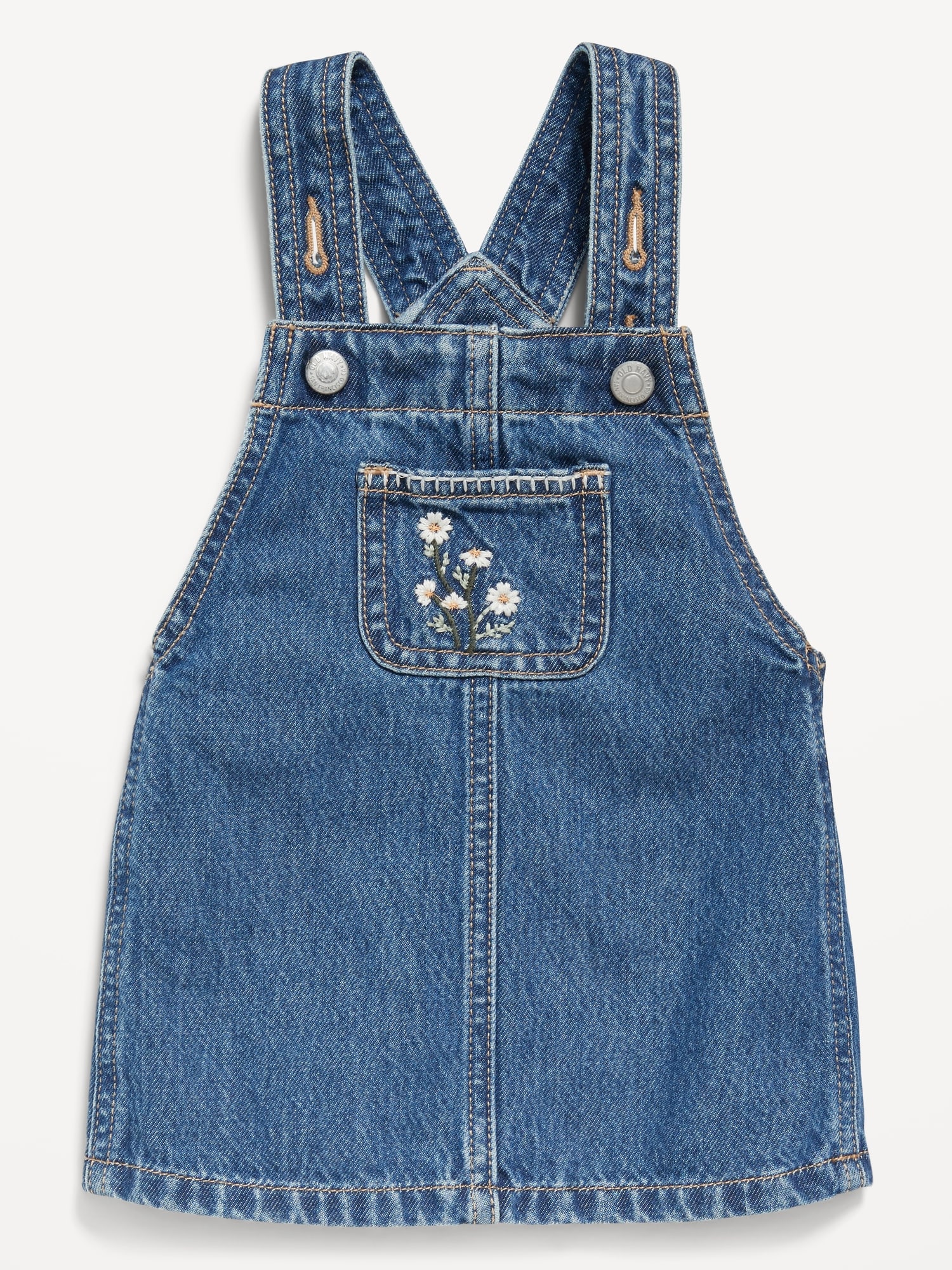 Embroidered Jean Skirtall Dress for Baby: adjustable shoulder straps, bib at chest, patch pockets at back, embroidered floral pattern at bib, #759535