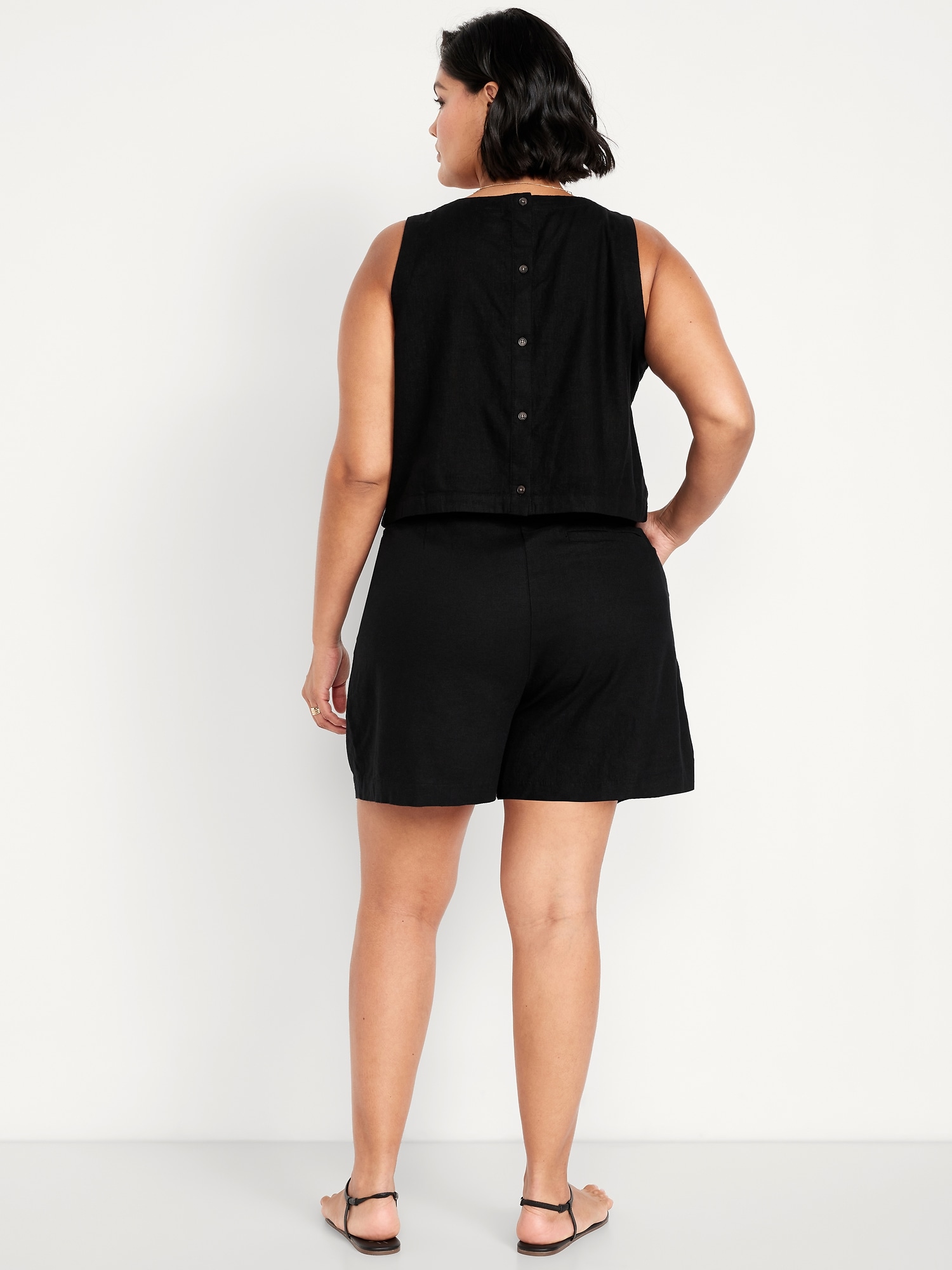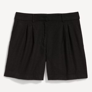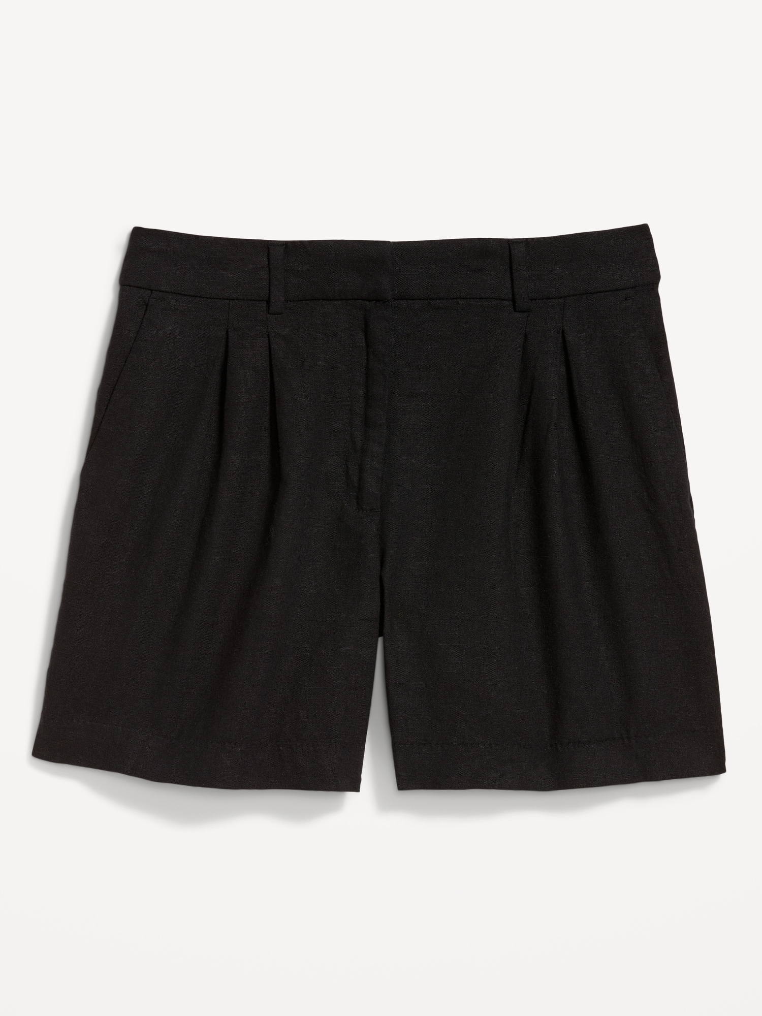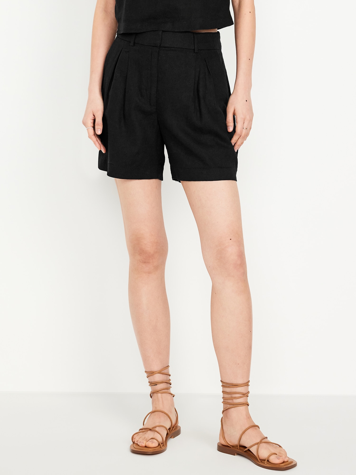 Extra High-Waisted Linen-Blend Taylor Trouser Shorts — 5-inch inseam: extra high adjustable waist, hook-and-bar closure, belt loops, hip pockets, functional back welt pocket, pleated front, #748111