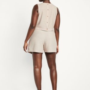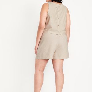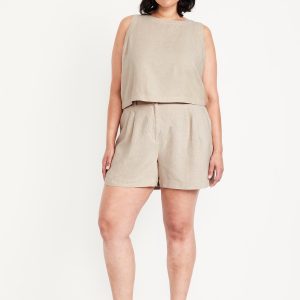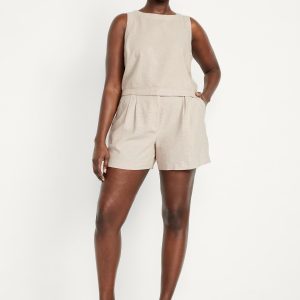 Extra High-Waisted Linen-Blend Taylor Trouser Shorts — 5-inch inseam: extra high adjustable waist, hook-and-bar closure, belt loops, hip pockets, functional back welt pocket, pleated front, #748111