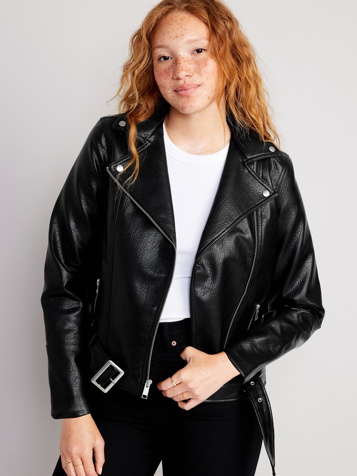 Faux-Leather Belted Biker Jacket: notched lapel, snap buttons, long sleeves, full-zip front, zip welt pockets, belted hem, #752075