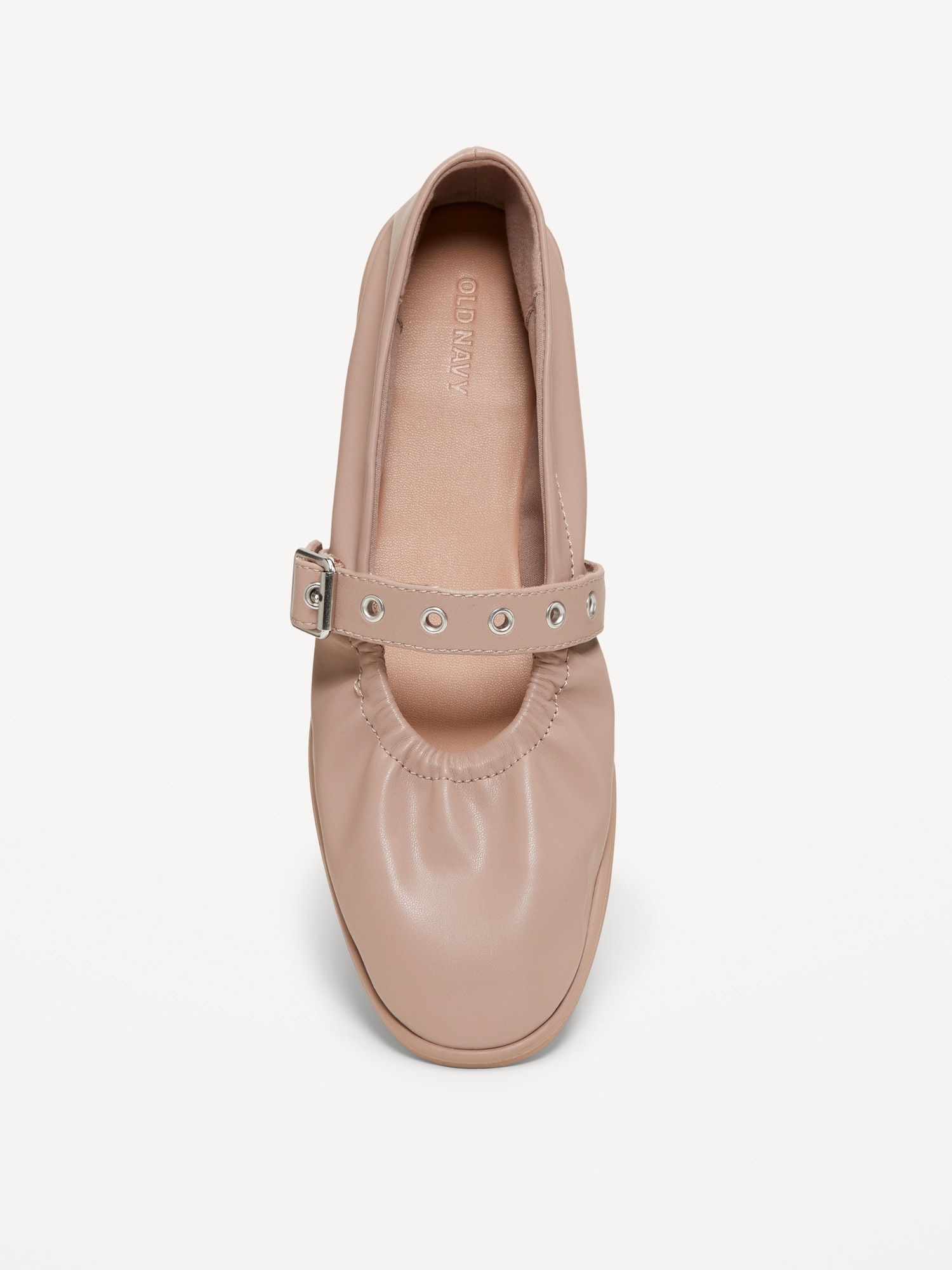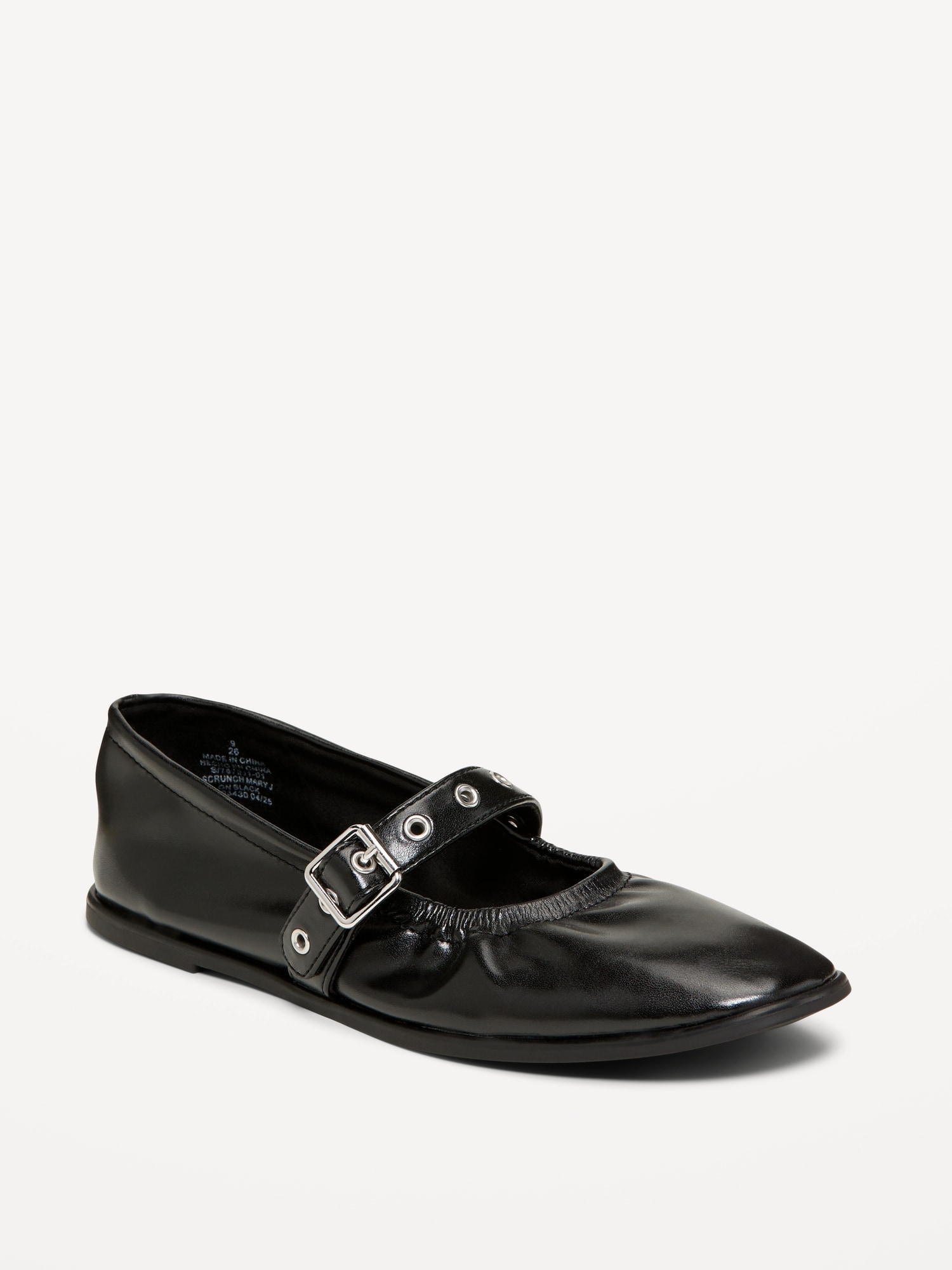 Faux-Leather Mary-Jane Scrunch Ballet Flats: wide metal-buckle strap with eyelets, pointed toe, scrunched opening, textured outsole, #787911