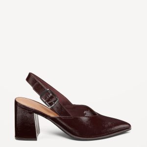 Faux-Leather Slingback Heels for Women: pointed toe, wide buckled ankle strap, block heel, #788065