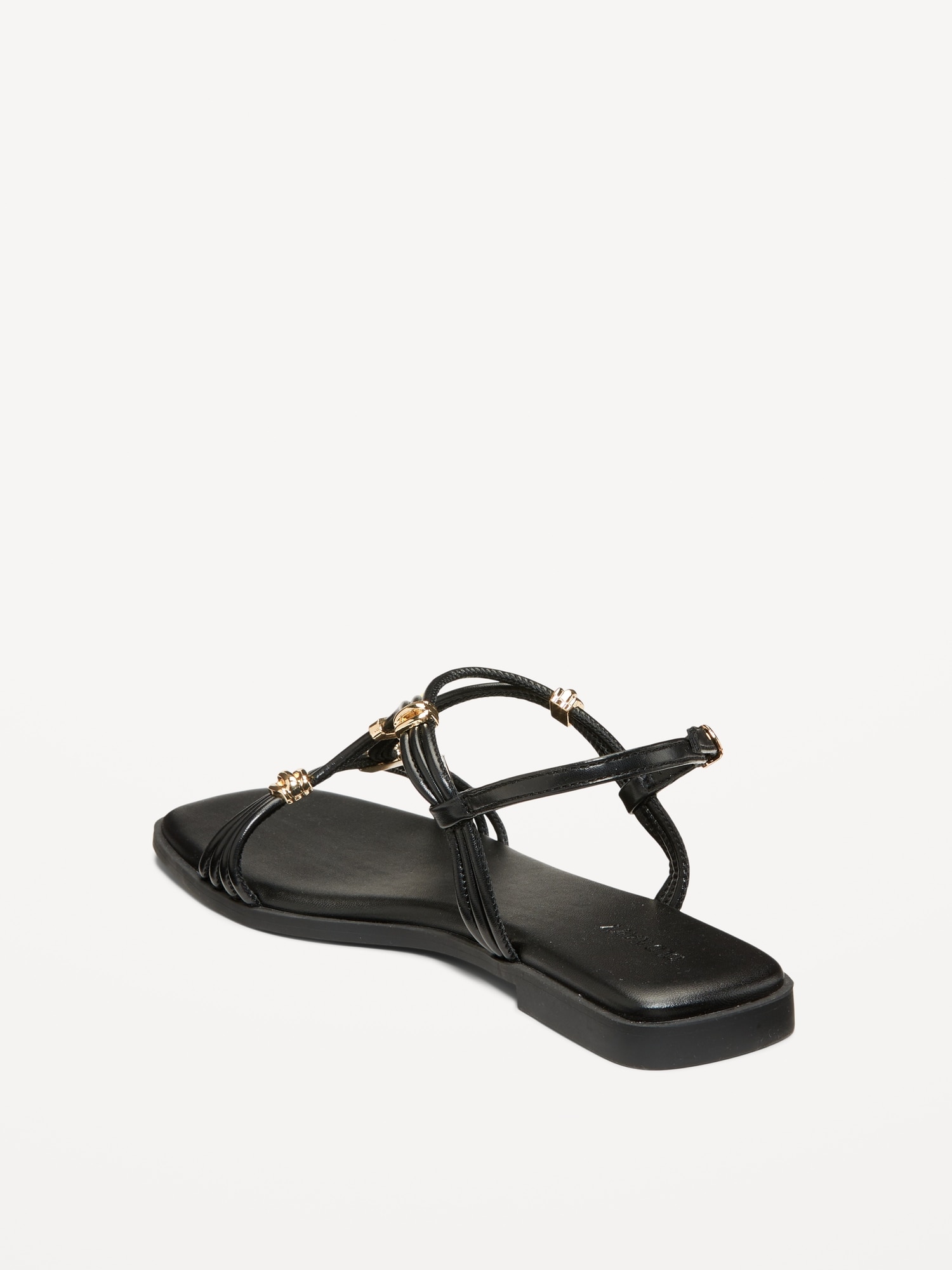 Faux-Leather Strappy Hardware Sandals: faux-leather upper, black: knotted gold-tone detail, bone: knotted silver-tone detail, buckle fastening at ankle, cushioned foot bed, #751054