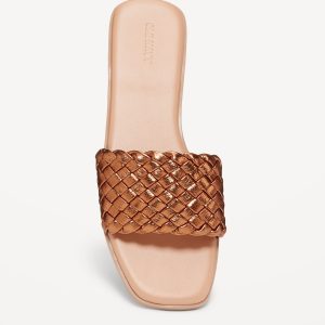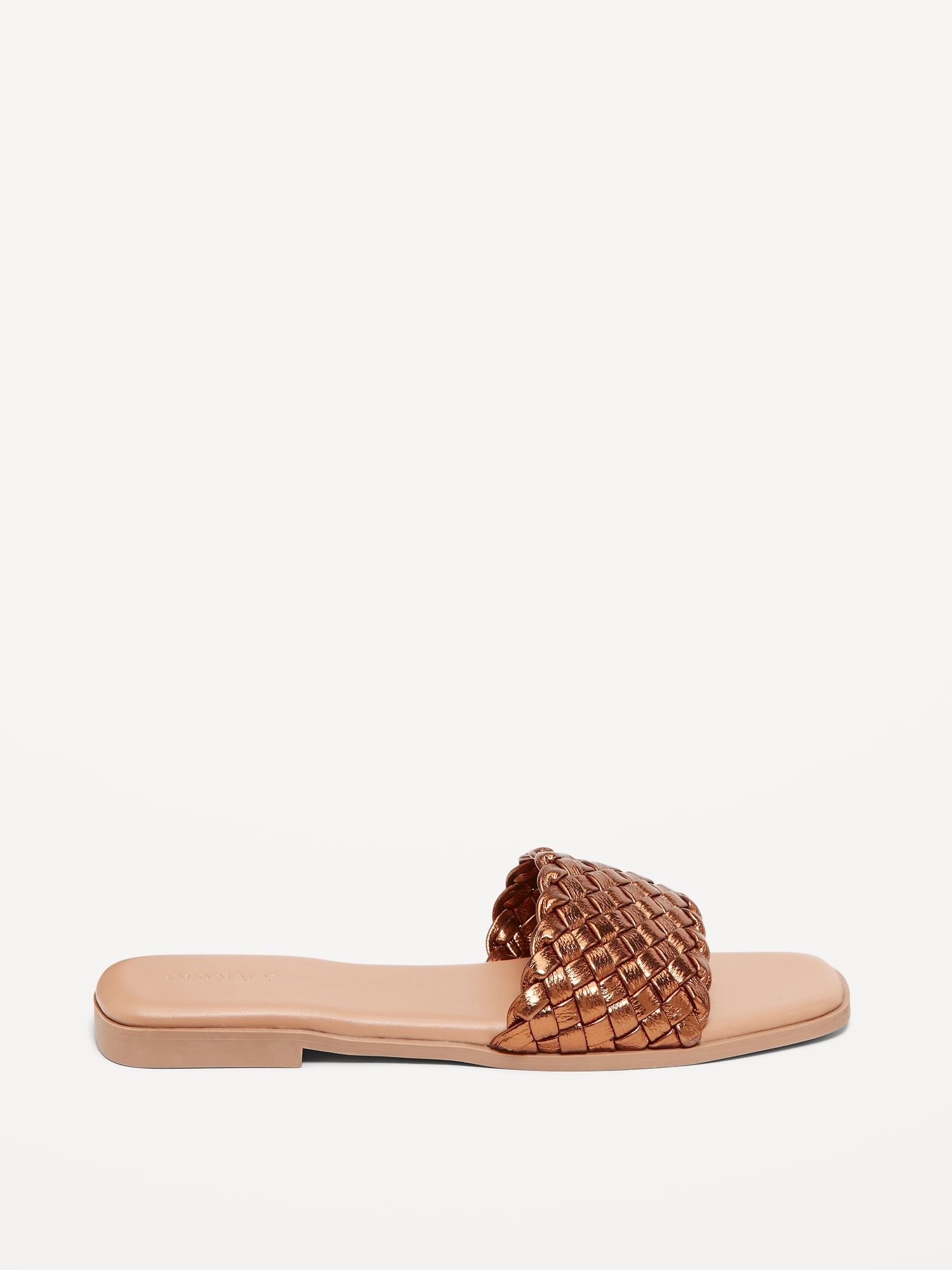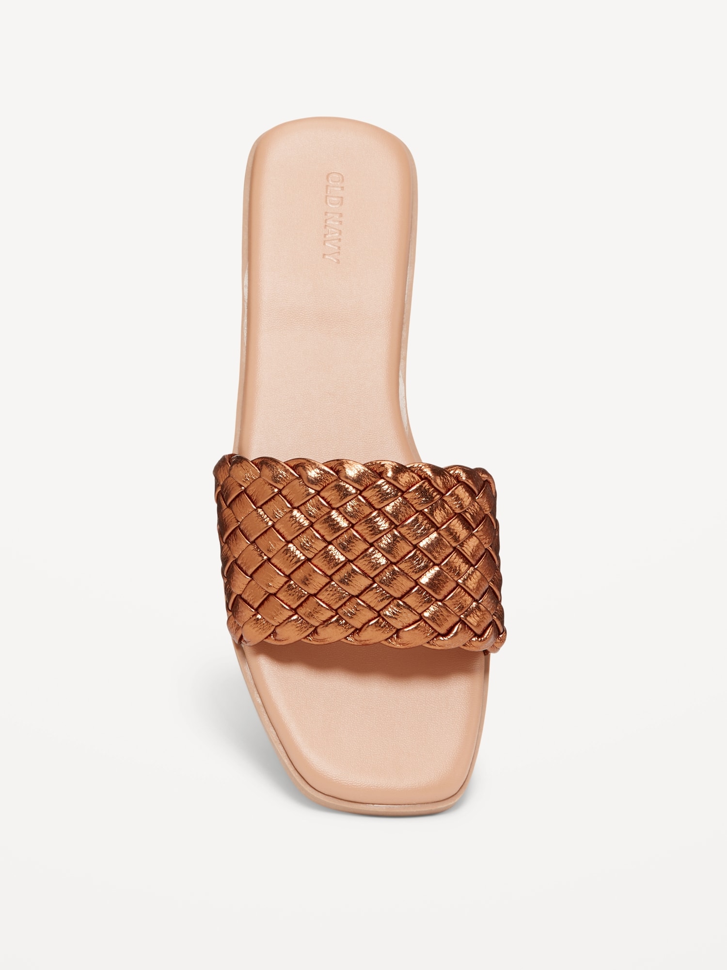 Faux-Leather Woven Slide Sandals: single strap upper, square toe, cushioned foot bed, slide-on style, #684808