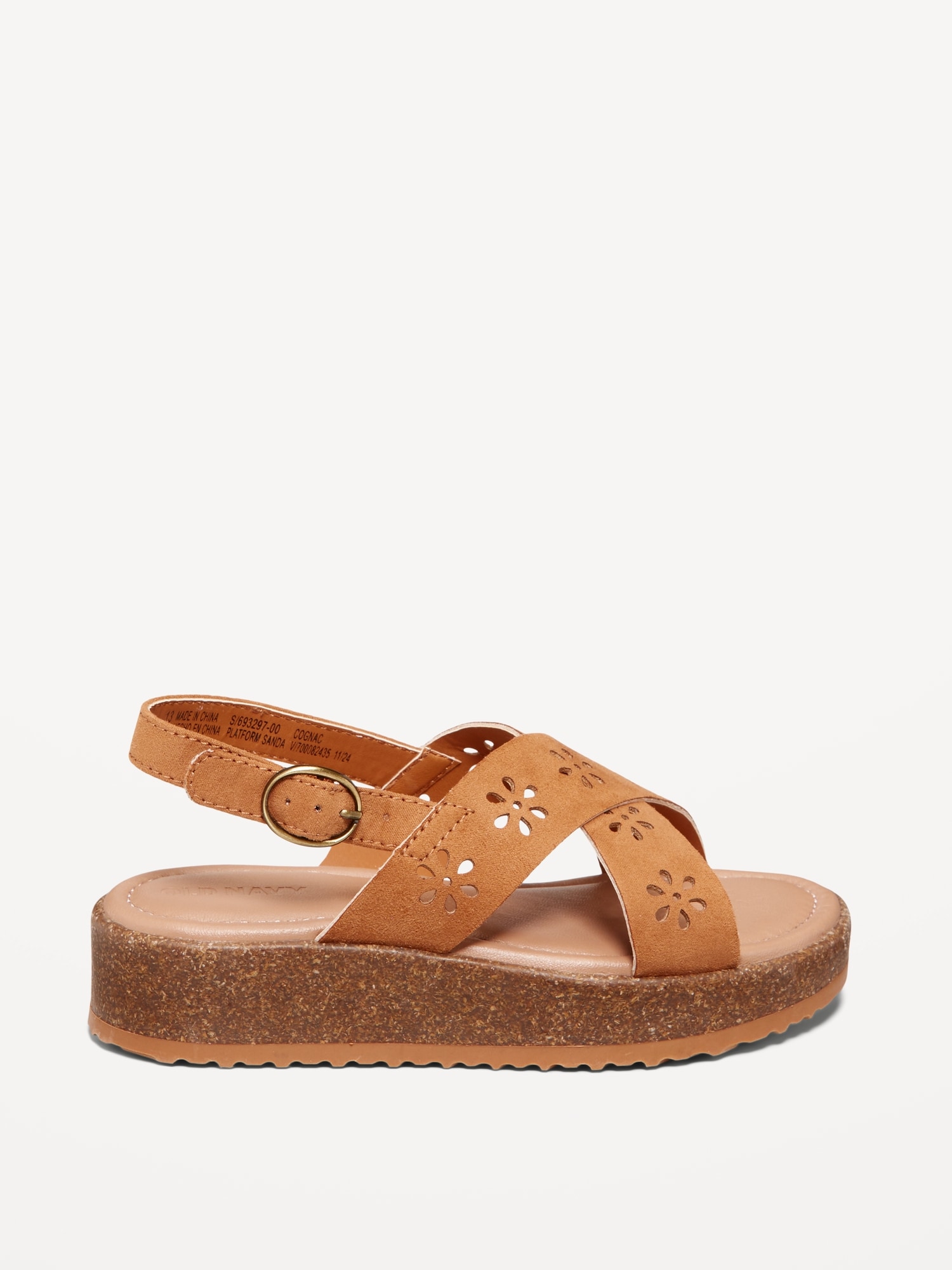 Faux-Suede Platform Sandals for Girls: wide double straps across, buckled ankle strap, cushioned foot bed, 1 1/2″ platform, cork midsole and textured outsole, #693297