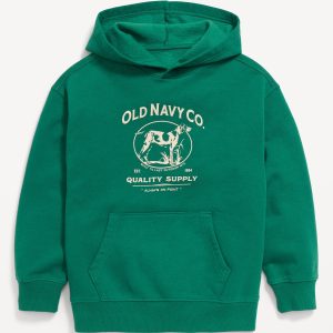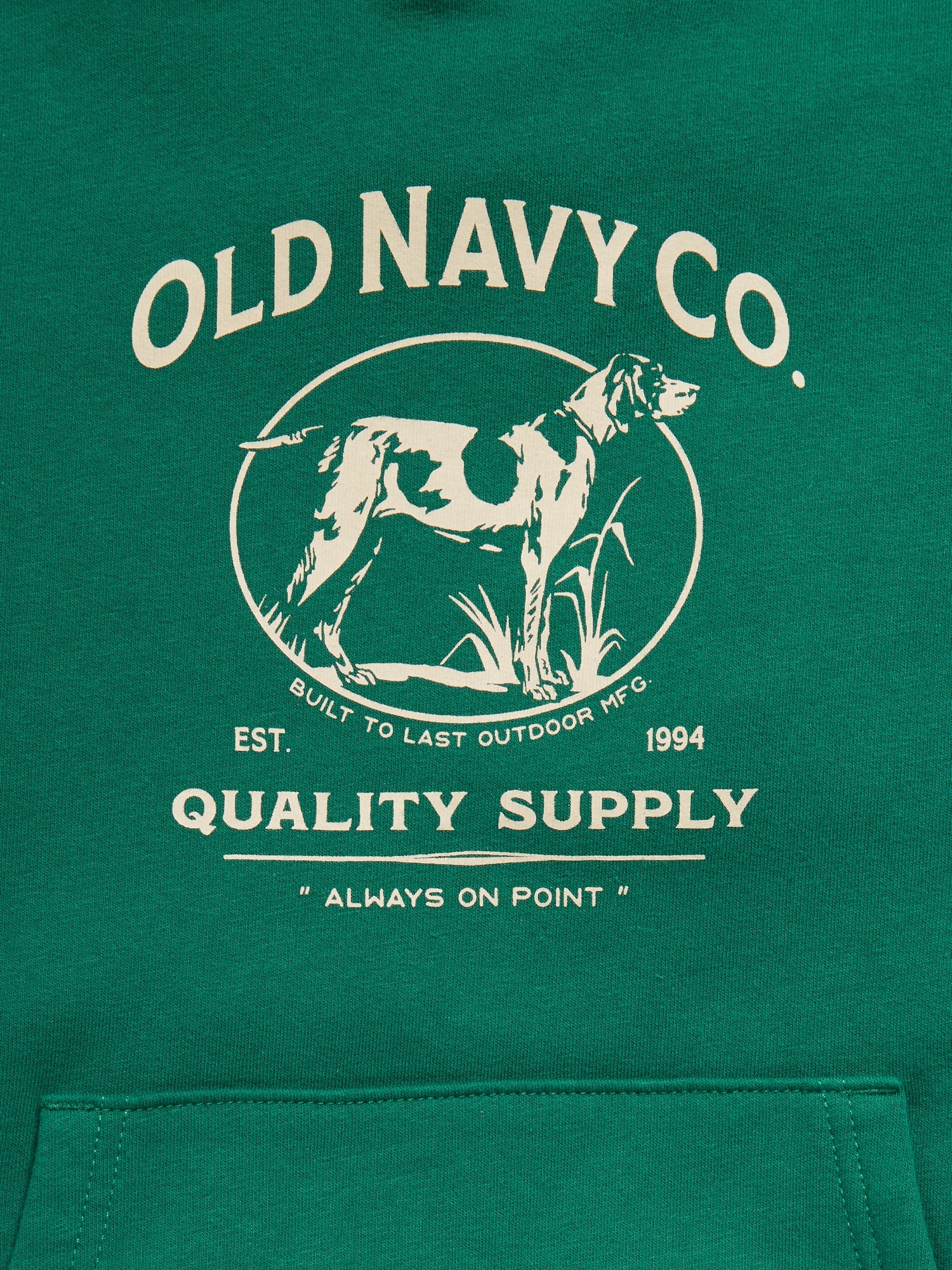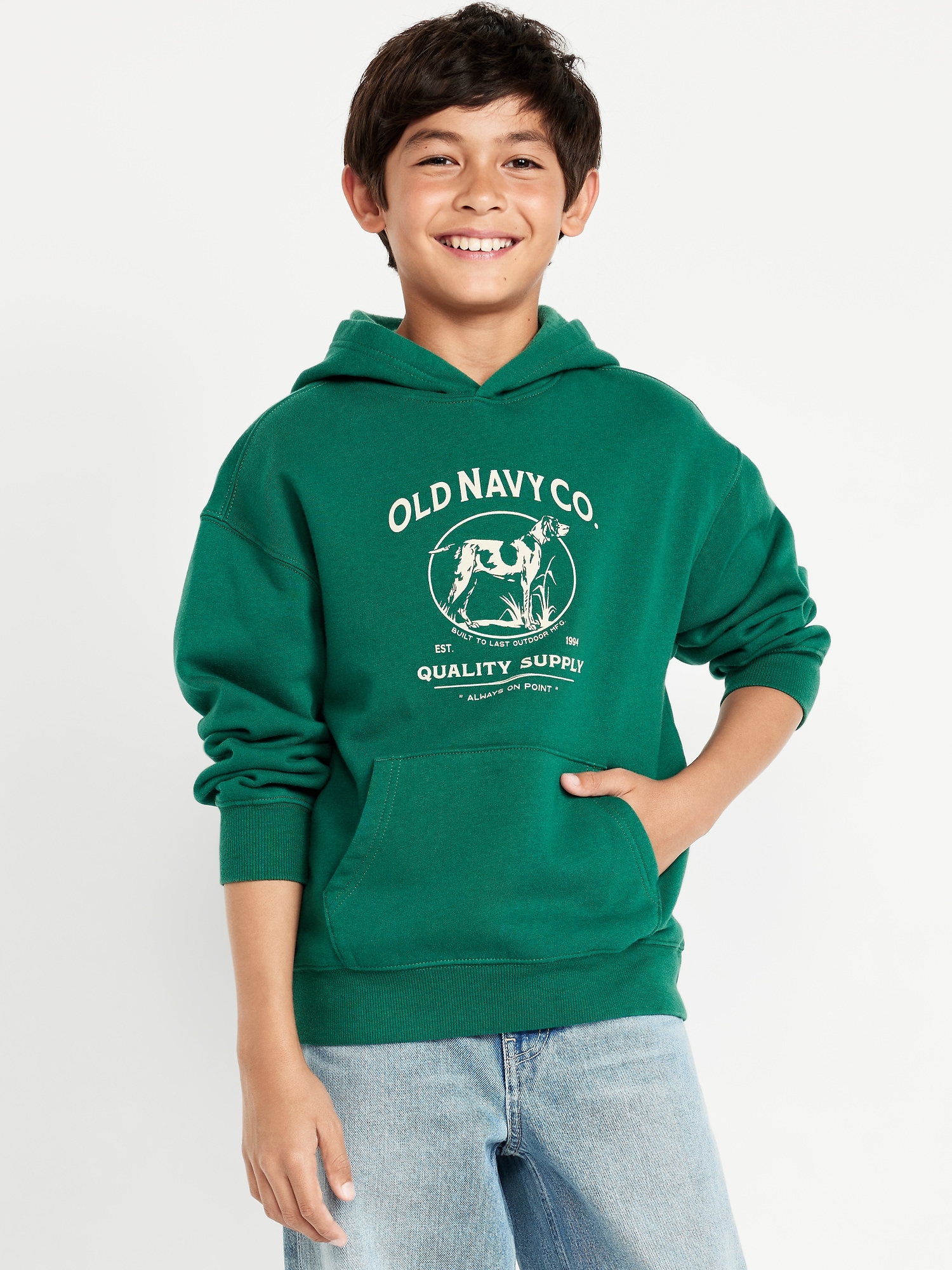 Favorite Fleece Oversized Logo-Graphic Pullover Hoodie for Boys: built-in hood, long sleeves, drop shoulders, kangaroo pocket, logo graphic at front, #799641