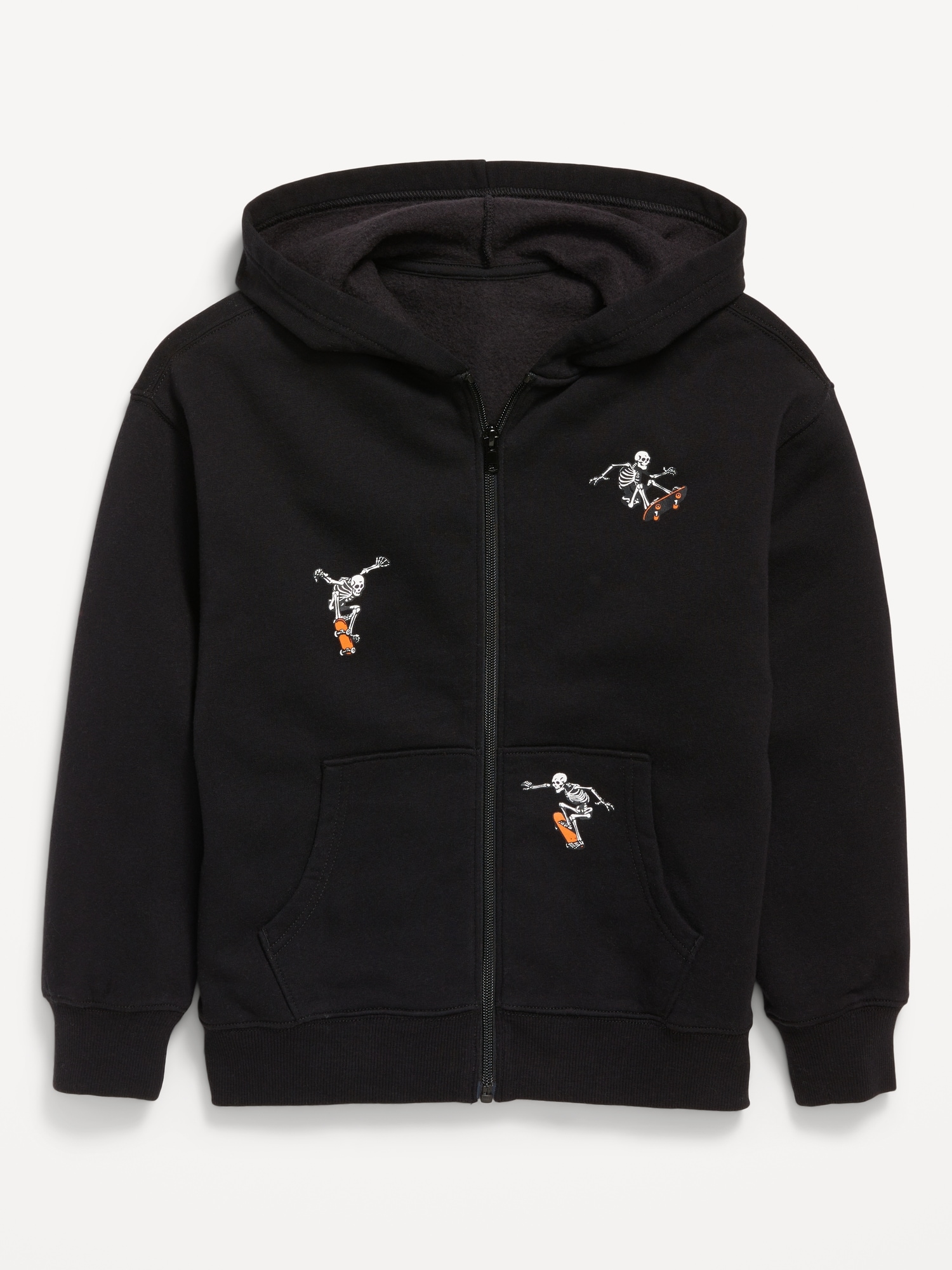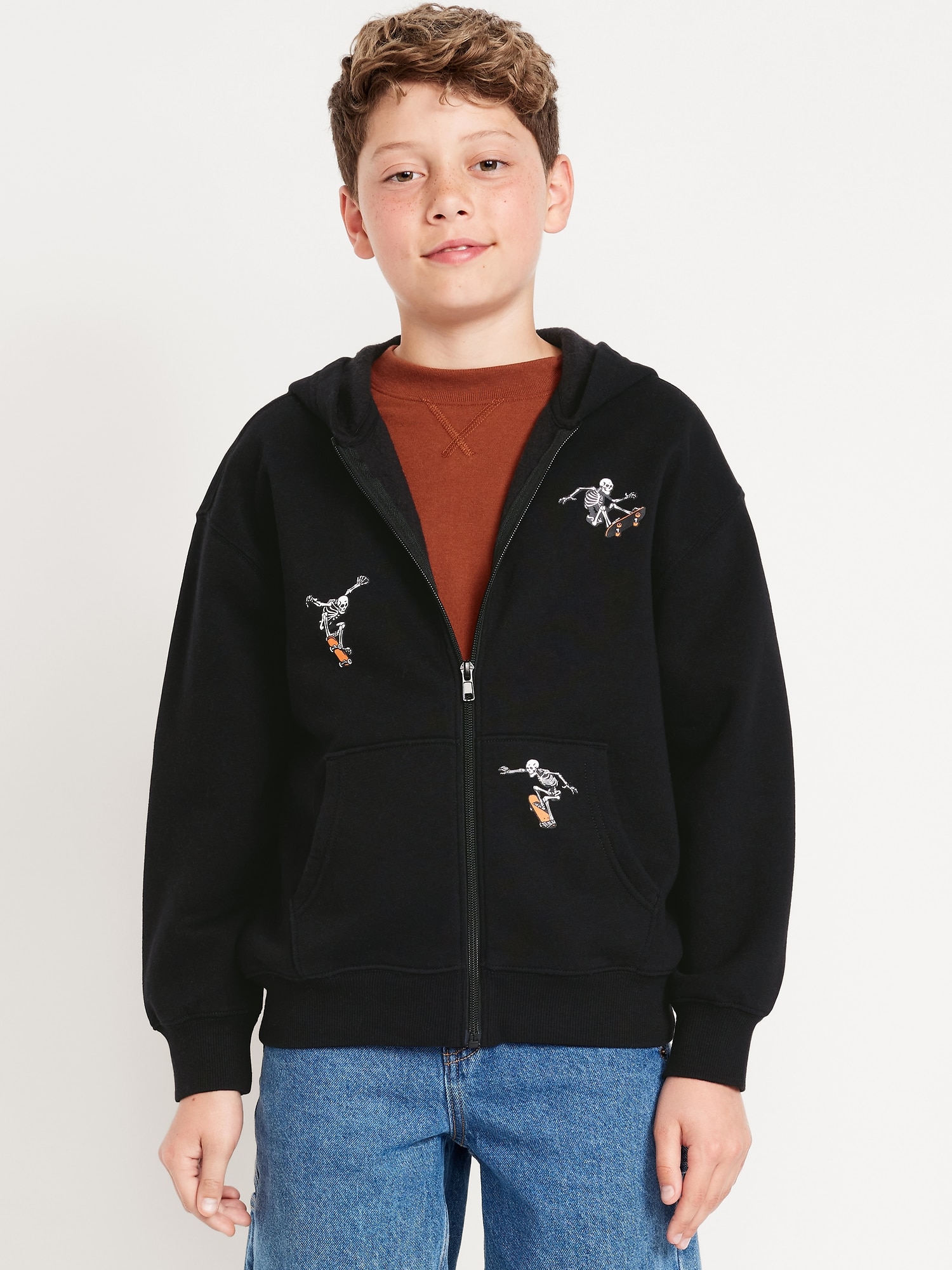 Favorite Fleece Oversized Zip Hoodie for Boys: built-in hood, long sleeves, drop shoulders, full length zipper, hand-warming scoop pockets, banded hem, all-over pattern or graphic, #761765
