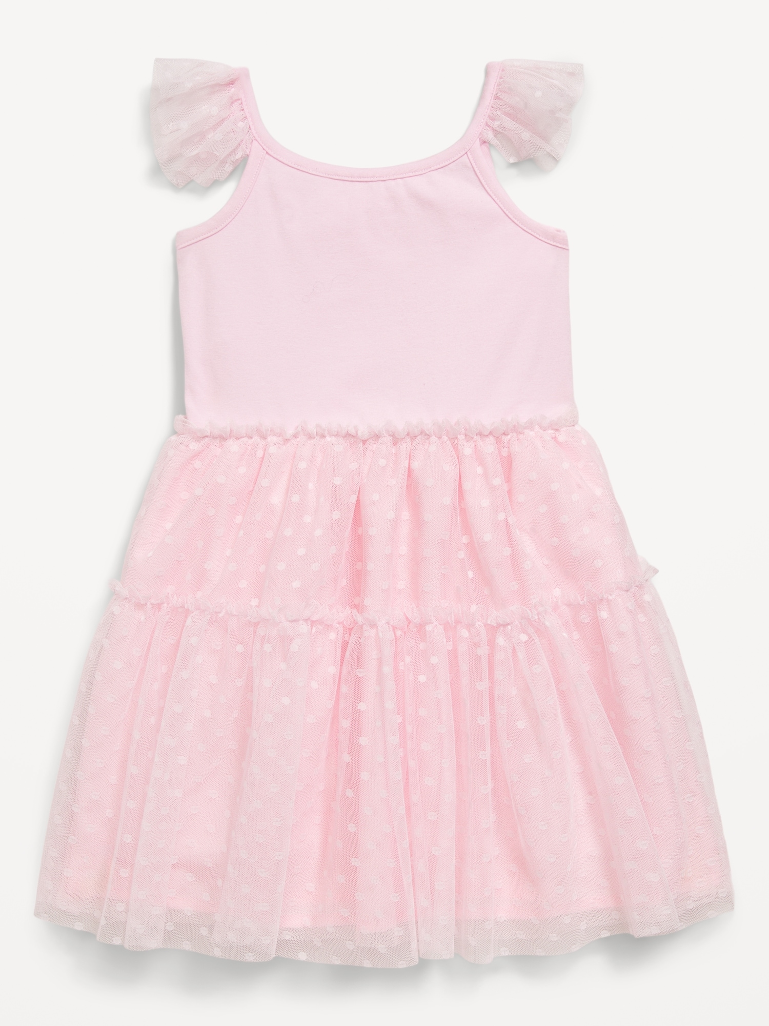 Fit and Flare Cami Tutu Dress for Toddler Girls: rounded neckline, thin straps, flutter tulle trim at shoulders, ruffled seamed waist, flared tutu skirt, lightweight tulle mesh layers, all-over dotted pattern, online exclusive, #766779