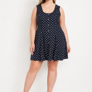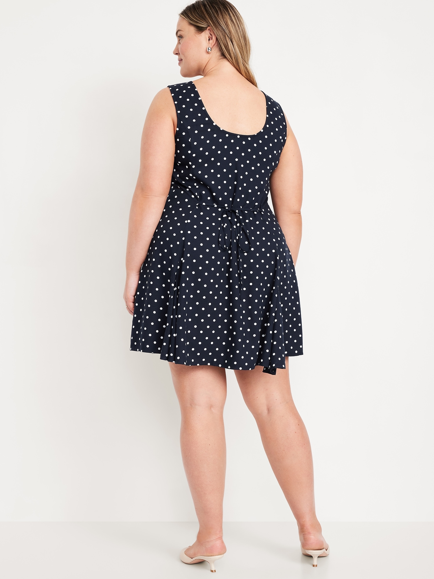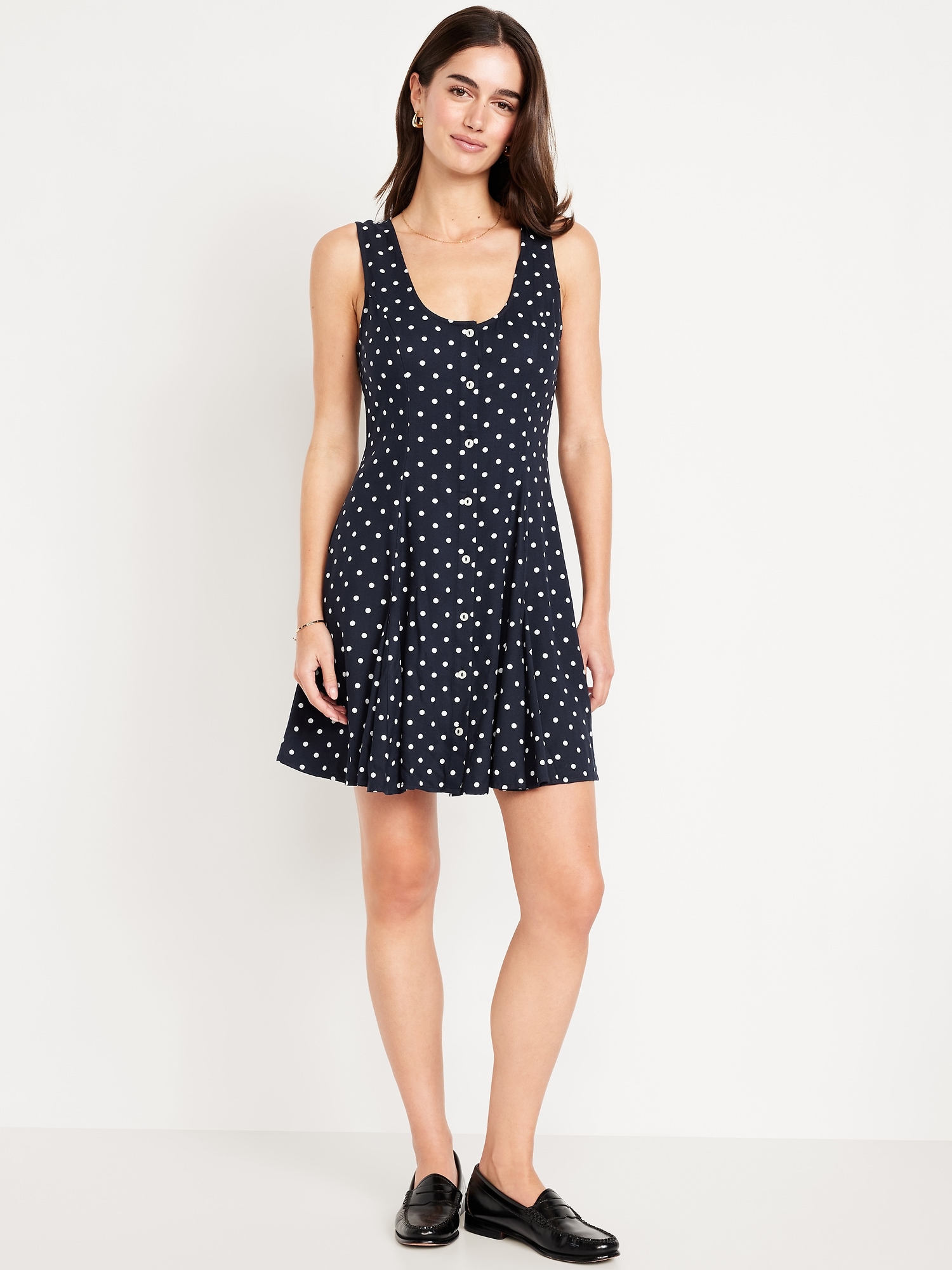 Fit & Flare Crepe Button-Front Mini Dress: scoop neck, wide straps, tie-back waist, full button front, princess seams, #798239