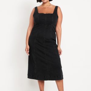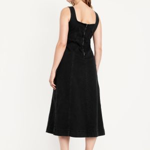 Fit & Flare Sleeveless Denim Midi Dress: square neck, wide straps, center back zipper, seamed skirt, #824527
