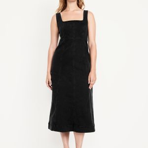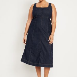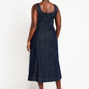 Fit & Flare Sleeveless Denim Midi Dress: square neck, wide straps, center back zipper, seamed skirt, #824527