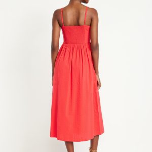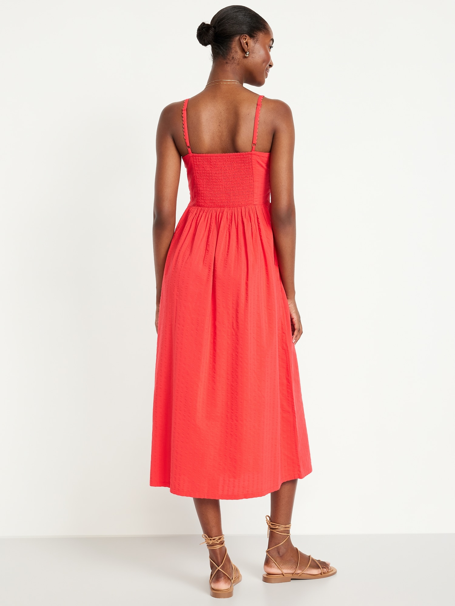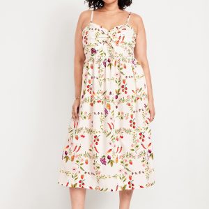 Fit & Flare Tie-Front Midi Dress: adjustable straps, knotted tie front, on-seam pockets, seamed shirred waist, smocked back, all-over fruit and floral print, #766927